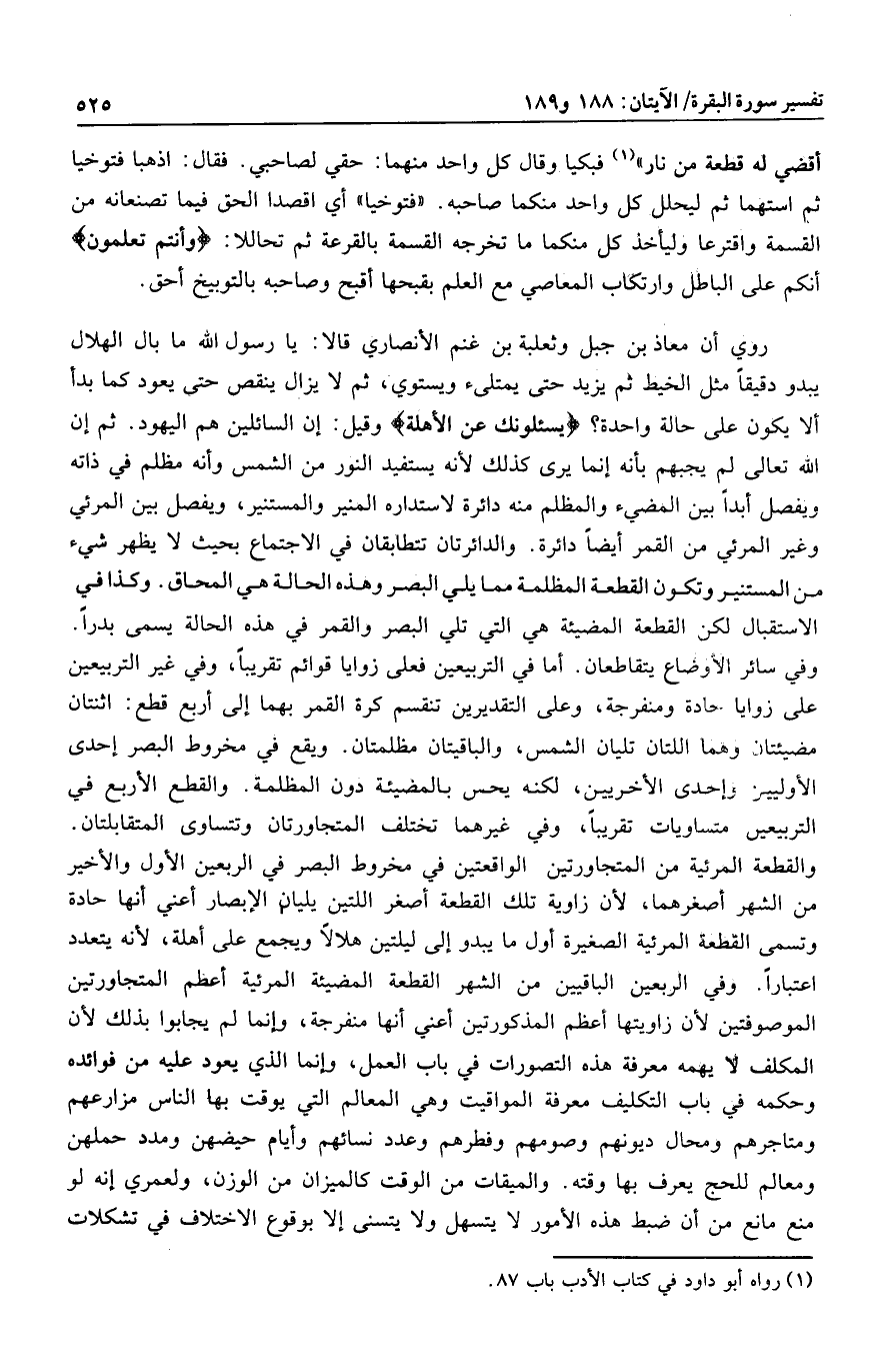 روي أن معاذ بن جبل وثعلبة بن غنم الأنصاري قالا: يا رسول الله ما بال الهلال يبدو دقيقا مثل الخيط ثم يزيد حتى يمتلىء ويستوي، ثم لا يزال ينقص حتى يعود كما بدأ ألا يكون على حالة واحدة؟ يَسْئَلُونَكَ عَنِ الْأَهِلَّةِ وقيل: إن السائلين هم اليهود. ثم إن الله تعالى لم يجبهم بأنه إنما يرى كذلك لأنه يستفيد النور من الشمس وأنه مظلم في ذاته ويفصل أبدا بين المضيء والمظلم منه دائرة لاستداره المنير والمستنير، ويفصل بين المرئي وغير المرئي من القمر أيضا دائرة. والدائرتان تتطابقان في الاجتماع بحيث لا يظهر شيء من المستنير وتكون القطعة المظلمة مما يلي البصر وهذه الحالة هي المحاق. وكذا في الاستقبال لكن القطعة المضيئة هي التي تلي البصر والقمر في هذه الحالة يسمى بدرا.
