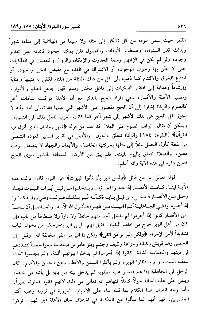 قوله تعالى عز من قائل وَلَيْسَ الْبِرُّ بِأَنْ تَأْتُوا الْبُيُوتَ عن البراء قال: نزلت هذه الآية فينا. كانت الأنصار إذا حجوا فجاؤا لم يدخلوا من قبل أبواب البيوت فجاء رجل من الأنصار فدخل من قبل بابه فكأنه عير بذلك فنزلت وفي رواية كانوا إذا أحرموا في الجاهلية أتوا البيت من ظهره فأنزل الله الآية. والحاصل أن ناسا من الأنصار كانوا إذا أحرموا لم يدخل أحد منهم حائطا ولا دارا ولا فسطاطا من باب فإن كان من أهل الوبر خرج من خلف الخباء. فقيل لهم: ليس البر بتحرجكم من دخول الباب تشديدا لأمر الإحرام وَلكِنَّ الْبِرَّ بر مَنِ اتَّقى ولكن ذا البر من اتقى مخالفة الله. وقيل: إن الحمس وهم قريش وكنانة وخزاعة وثقيف وجشم وبنو عامر بن صعصعة سموا حمسا لتشددهم في دينهم والحماسة الشدة. كانوا إذا أحرموا لم يدخلوا بيوتهم البتة، ولم يجلسوا تحت سقف البيت، ولم يستظلوا الوبر، ولم يأكلوا السمن والأقط. وعن الحسن والأصم: كان الرجل في الجاهلية إذا هم فتعسر عليه مطلوبه لم يدخل بيته من بابه بل يأتيه من خلفه، ويبقى على هذه الحالة حولا كاملا فنهاهم الله تعالى عن ذلك لأنهم كانوا يفعلونه تطيرا.