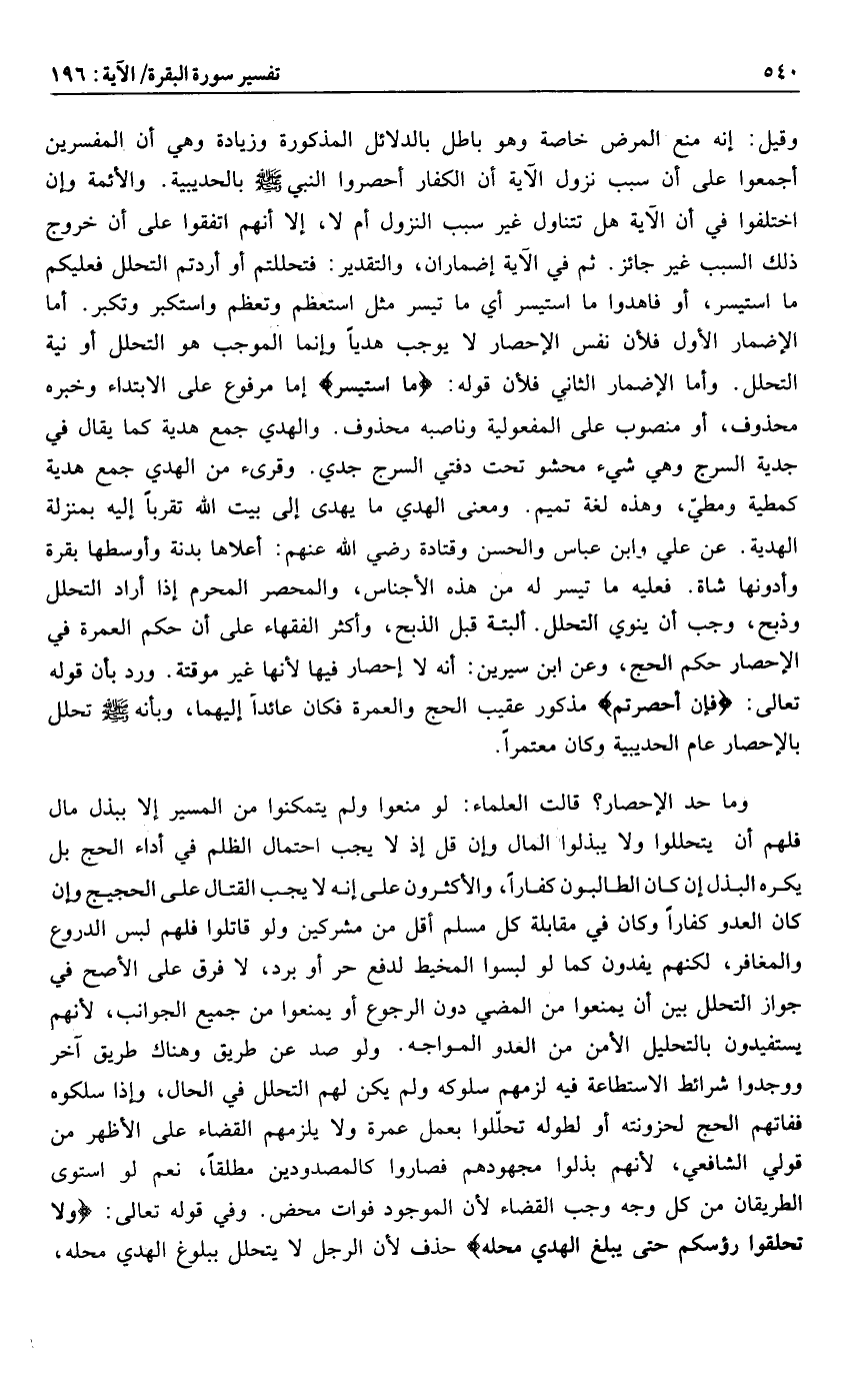 وما حد الإحصار؟ قالت العلماء: لو منعوا ولم يتمكنوا من المسير إلا ببذل مال فلهم أن يتحللوا ولا يبذلوا المال وإن قل إذ لا يجب احتمال الظلم في أداء الحج بل يكره البذل إن كان الطالبون كفارا، والأكثرون على إنه لا يجب القتال على الحجيج وإن كان العدو كفارا وكان في مقابلة كل مسلم أقل من مشركين ولو قاتلوا فلهم لبس الدروع والمغافر، لكنهم يفدون كما لو لبسوا المخيط لدفع حر أو برد، لا فرق على الأصح في جواز التحلل بين أن يمنعوا من المضي دون الرجوع أو يمنعوا من جميع الجوانب، لأنهم يستفيدون بالتحليل الأمن من العدو المواجه. ولو صد عن طريق وهناك طريق آخر ووجدوا شرائط الاستطاعة فيه لزمهم سلوكه ولم يكن لهم التحلل في الحال، وإذا سلكوه ففاتهم الحج لحزونته أو لطوله تحلّلوا بعمل عمرة ولا يلزمهم القضاء على الأظهر من قولي الشافعي، لأنهم بذلوا مجهودهم فصاروا كالمصدودين مطلقا، نعم لو استوى الطريقان من كل وجه وجب القضاء لأن الموجود فوات محض. وفي قوله تعالى: وَلا تَحْلِقُوا رُؤُسَكُمْ حَتَّى يَبْلُغَ الْهَدْيُ مَحِلَّهُ حذف لأن الرجل لا يتحلل ببلوغ الهدي محله،