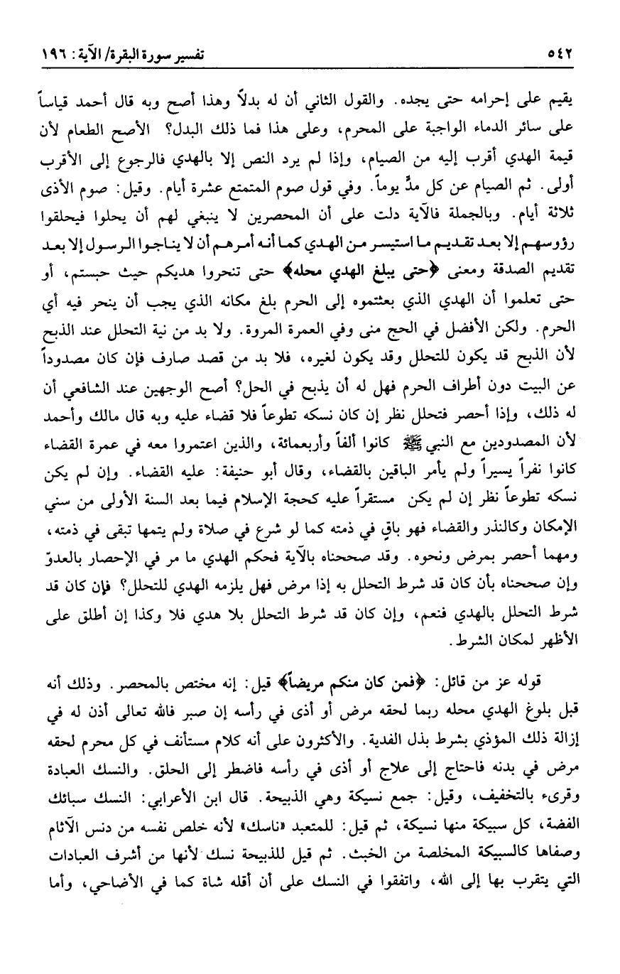 قوله عز من قائل: فَمَنْ كانَ مِنْكُمْ مَرِيضاً قيل: إنه مختص بالمحصر. وذلك أنه قبل بلوغ الهدي محله ربما لحقه مرض أو أذى في رأسه إن صبر فالله تعالى أذن له في إزالة ذلك المؤذي بشرط بذل الفدية. والأكثرون على أنه كلام مستأنف في كل محرم لحقه مرض في بدنه فاحتاج إلى علاج أو أذى في رأسه فاضطر إلى الحلق. والنسك العبادة وقرىء بالتخفيف، وقيل: جمع نسيكة وهي الذبيحة. قال ابن الأعرابي: النسك سبائك الفضة، كل سبيكة منها نسيكة، ثم قيل: للمتعبد «ناسك» لأنه خلص نفسه من دنس الآثام وصفاها كالسبيكة المخلصة من الخبث. ثم قيل للذبيحة نسك لأنها من أشرف العبادات التي يتقرب بها إلى الله، واتفقوا في النسك على أن أقله شاة كما في الأضاحي، وأما