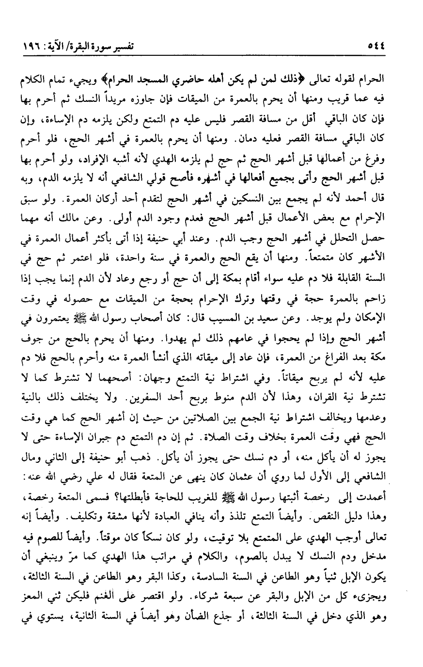 الحرام لقوله تعالى ذلِكَ لِمَنْ لَمْ يَكُنْ أَهْلُهُ حاضِرِي الْمَسْجِدِ الْحَرامِ ويجيء تمام الكلام فيه عما قريب ومنها أن يحرم بالعمرة من الميقات فإن جاوزه مريدا النسك ثم أحرم بها فإن كان الباقي أقل من مسافة القصر فليس عليه دم التمتع ولكن يلزمه دم الإساءة، وإن كان الباقي مسافة القصر فعليه دمان. ومنها أن يحرم بالعمرة في أشهر الحج، فلو أحرم وفرغ من أعمالها قبل أشهر الحج ثم حج لم يلزمه الهدي لأنه أشبه الإفراد، ولو أحرم بها قبل أشهر الحج وأتى بجميع أفعالها في أشهره فأصح قولي الشافعي أنه لا يلزمه الدم، وبه قال أحمد لأنه لم يجمع بين النسكين في أشهر الحج لتقدم أحد أركان العمرة. ولو سبق الإحرام مع بعض الأعمال قبل أشهر الحج فعدم وجود الدم أولى. وعن مالك أنه مهما حصل التحلل في أشهر الحج وجب الدم. وعند أبي حنيفة إذا أتى بأكثر أعمال العمرة في الأشهر كان متمتعا. ومنها أن يقع الحج والعمرة في سنة واحدة، فلو اعتمر ثم حج في السنة القابلة فلا دم عليه سواء أقام بمكة إلى أن حج أو رجع وعاد لأن الدم إنما يجب إذا زاحم بالعمرة حجة في وقتها وترك الإحرام بحجة من الميقات مع حصوله في وقت الإمكان ولم يوجد. وعن سعيد بن المسيب قال: كان أصحاب رسول الله صلى الله عليه وسلم يعتمرون في أشهر الحج وإذا لم يحجوا في عامهم ذلك لم يهدوا. ومنها أن يحرم بالحج من جوف مكة بعد الفراغ من العمرة، فإن عاد إلى ميقاته الذي أنشأ العمرة منه وأحرم بالحج فلا دم عليه لأنه لم يربح ميقاتا. وفي اشتراط نية التمتع وجهان: أصحهما لا تشترط كما لا تشترط نية القران، وهذا لأن الدم منوط بربح أحد السفرين. ولا يختلف ذلك بالنية وعدمها ويخالف اشتراط نية الجمع بين الصلاتين من حيث إن أشهر الحج كما هي وقت الحج فهي وقت العمرة بخلاف وقت الصلاة. ثم إن دم التمتع دم جبران الإساءة حتى لا يجوز له أن يأكل منه، أو دم نسك حتى يجوز أن يأكل. ذهب أبو حنيفة إلى الثاني ومال الشافعي إلى الأول لما