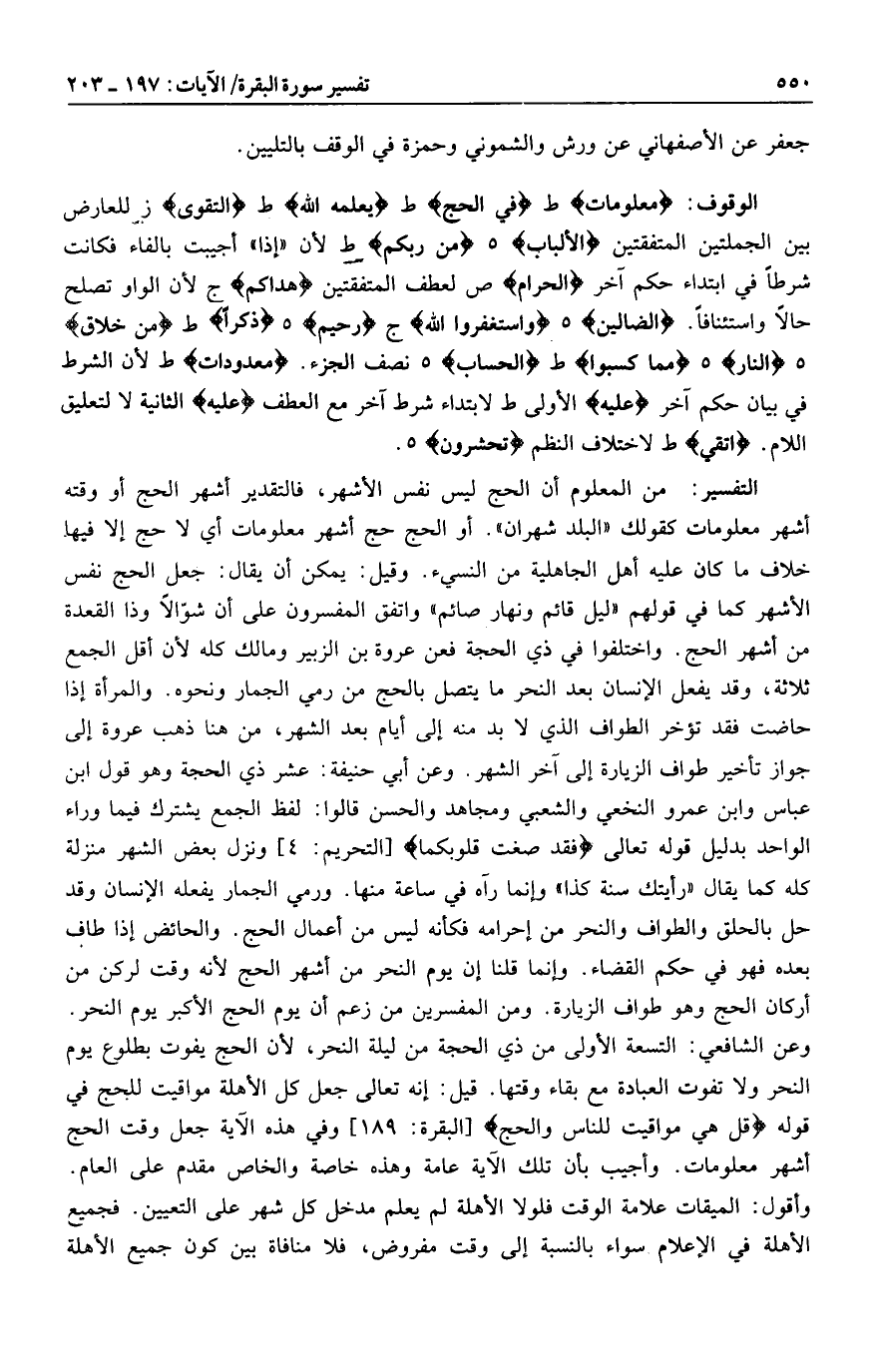 مَعْلُوماتٌ ط فِي الْحَجِّ ط يَعْلَمْهُ اللَّهُ ط التَّقْوى ز للعارض بين الجملتين المتفقتين الْأَلْبابِ هـ مِنْ رَبِّكُمْ ط لأن «إذا» أجيبت بالفاء فكانت شرطا في ابتداء حكم آخر الْحَرامِ ص لعطف المتفقتين هَداكُمْ ج لأن الواو تصلح حالا واستئنافا. الضَّالِّينَ هـ وَاسْتَغْفِرُوا اللَّهَ ج رَحِيمٌ هـ ذِكْراً ط مِنْ خَلاقٍ هـ النَّارِ هـ مِمَّا كَسَبُوا ط الْحِسابِ هـ نصف الجزء. مَعْدُوداتٍ ط لأن الشرط في بيان حكم آخر عَلَيْهِ الأولى ط لابتداء شرط آخر مع العطف عَلَيْهِ الثانية لا لتعليق اللام. اتَّقى ط لاختلاف النظم تُحْشَرُونَ هـ.
