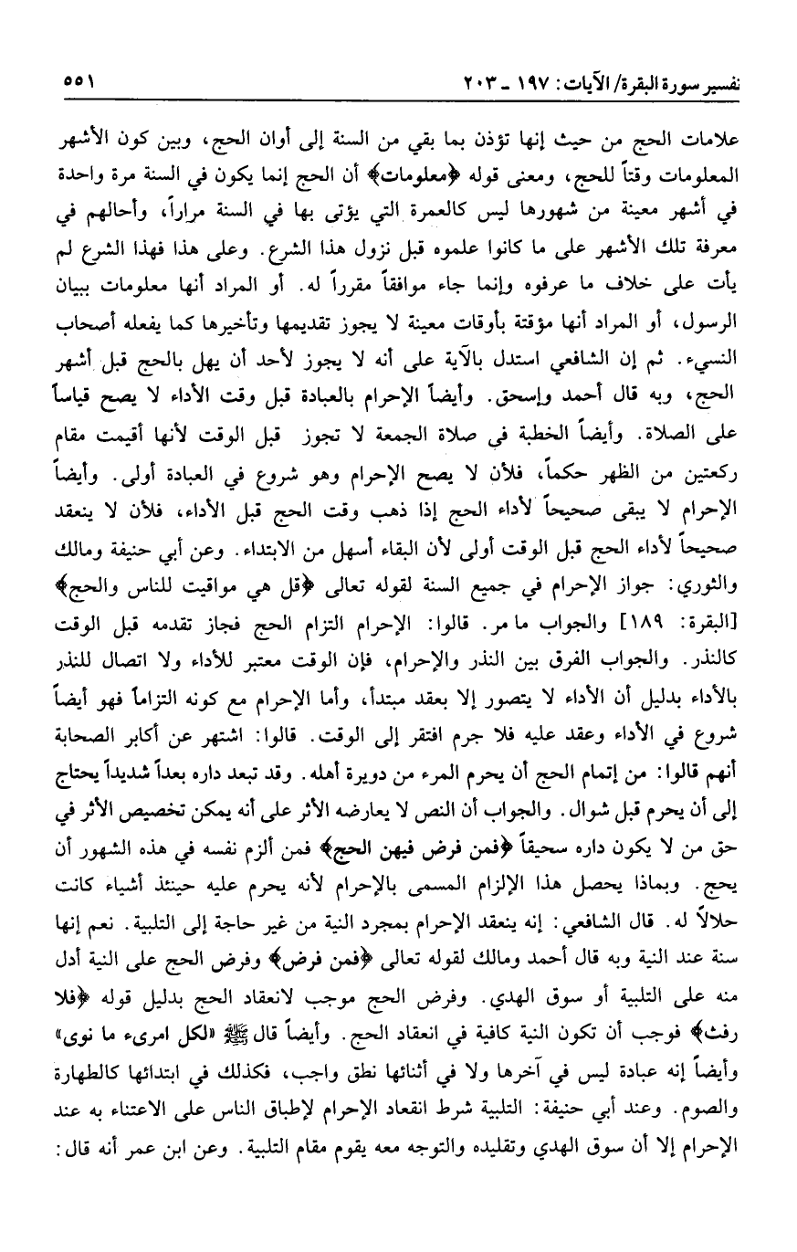 علامات الحج من حيث إنها تؤذن بما بقي من السنة إلى أوان الحج، وبين كون الأشهر المعلومات وقتا للحج، ومعنى قوله مَعْلُوماتٌ أن الحج إنما يكون في السنة مرة واحدة في أشهر معينة من شهورها ليس كالعمرة التي يؤتى بها في السنة مرارا، وأحالهم في معرفة تلك الأشهر على ما كانوا علموه قبل نزول هذا الشرع. وعلى هذا فهذا الشرع لم يأت على خلاف ما عرفوه وإنما جاء موافقا مقررا له. أو المراد أنها معلومات ببيان الرسول، أو المراد أنها مؤقتة بأوقات معينة لا يجوز تقديمها وتأخيرها كما يفعله أصحاب النسيء. ثم إن الشافعي استدل بالآية على أنه لا يجوز لأحد أن يهل بالحج قبل أشهر الحج، وبه قال أحمد وإسحق. وأيضا الإحرام بالعبادة قبل وقت الأداء لا يصح قياسا على الصلاة. وأيضا الخطبة في صلاة الجمعة لا تجوز قبل الوقت لأنها أقيمت مقام ركعتين من الظهر حكما، فلأن لا يصح الإحرام وهو شروع في العبادة أولى. وأيضا الإحرام لا يبقى صحيحا لأداء الحج إذا ذهب وقت الحج قبل الأداء، فلأن لا ينعقد صحيحا لأداء الحج قبل الوقت أولى لأن البقاء أسهل من الابتداء. وعن أبي حنيفة ومالك والثوري: جواز الإحرام في جميع السنة لقوله تعالى قُلْ هِيَ مَواقِيتُ لِلنَّاسِ وَالْحَجِّ [البقرة: 189] والجواب ما مر. قالوا: الإحرام التزام الحج فجاز تقدمه قبل الوقت كالنذر. والجواب الفرق بين النذر والإحرام، فإن الوقت معتبر للأداء ولا اتصال للنذر بالأداء بدليل أن الأداء لا يتصور إلا بعقد مبتدأ، وأما الإحرام مع كونه التزاما فهو أيضا شروع في الأداء وعقد عليه فلا جرم افتقر إلى الوقت. قالوا: اشتهر عن أكابر الصحابة أنهم قالوا: من إتمام الحج أن يحرم المرء من دويرة أهله. وقد تبعد داره بعدا شديدا يحتاج إلى أن يحرم قبل شوال. والجواب أن النص لا يعارضه الأثر على أنه يمكن تخصيص الأثر في حق من لا يكون داره سحيقا فَمَنْ فَرَضَ فِيهِنَّ الْحَجَّ فمن ألزم نفسه في هذه الشهور أن يحج. وبماذا يحصل هذا الإلزام المسمى بالإحرام لأنه يحرم عليه حينئذ أشياء كانت حلالا له. قال الشافعي: إنه ينعقد الإحرام بمجرد النية من غير حاجة إلى التلبية. نعم إنها سنة عند النية وبه قال أحمد ومالك لقوله تعالى فَمَنْ فَرَضَ وفرض الحج على النية أدل منه على التلبية أو سوق الهدي. وفرض الحج موجب لانعقاد الحج بدليل قوله فَلا رَفَثَ فوجب أن تكون النية كافية في انعقاد الحج. وأيضا
