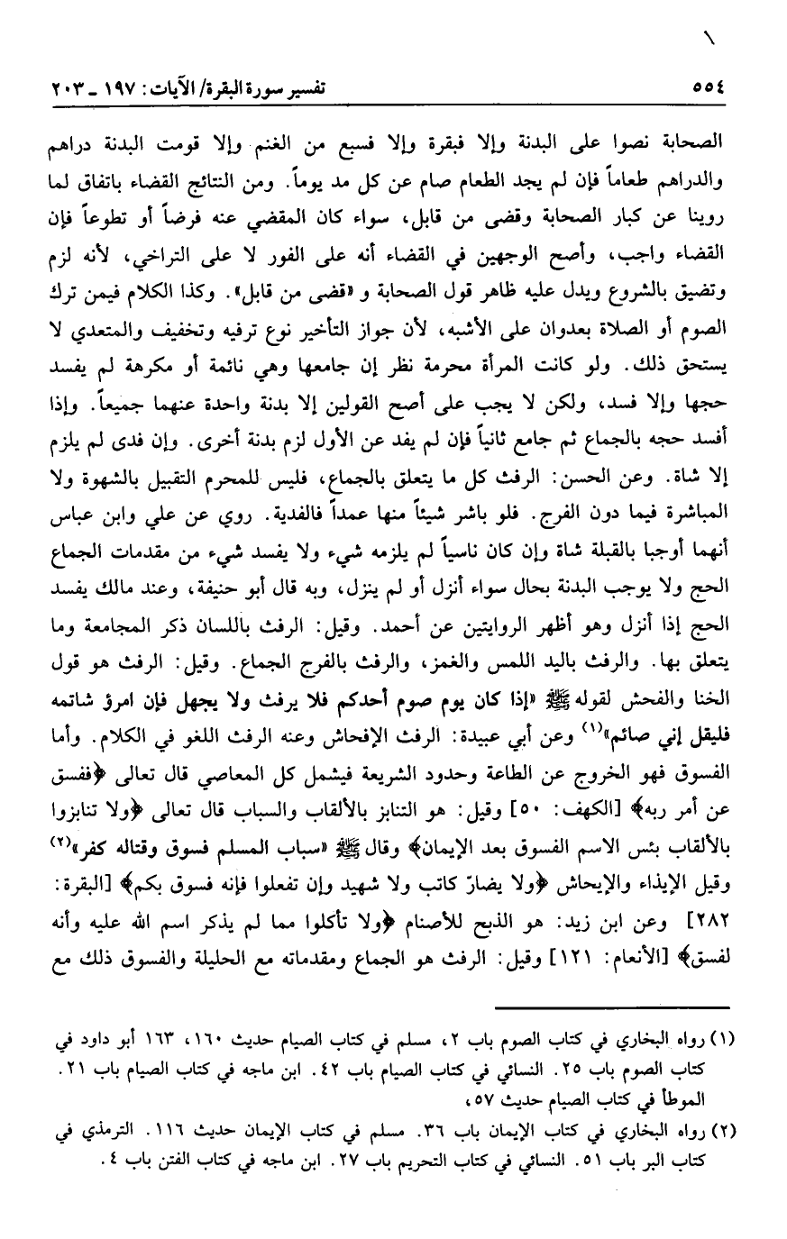 وعن أبي عبيدة: الرفث الإفحاش وعنه الرفث اللغو في الكلام. وأما الفسوق فهو الخروج عن الطاعة وحدود الشريعة فيشمل كل المعاصي قال تعالى فَفَسَقَ عَنْ أَمْرِ رَبِّهِ [الكهف: 50] وقيل: هو التنابز بالألقاب والسباب قال تعالى وَلا تَنابَزُوا بِالْأَلْقابِ بِئْسَ الِاسْمُ الْفُسُوقُ بَعْدَ الْإِيمانِ