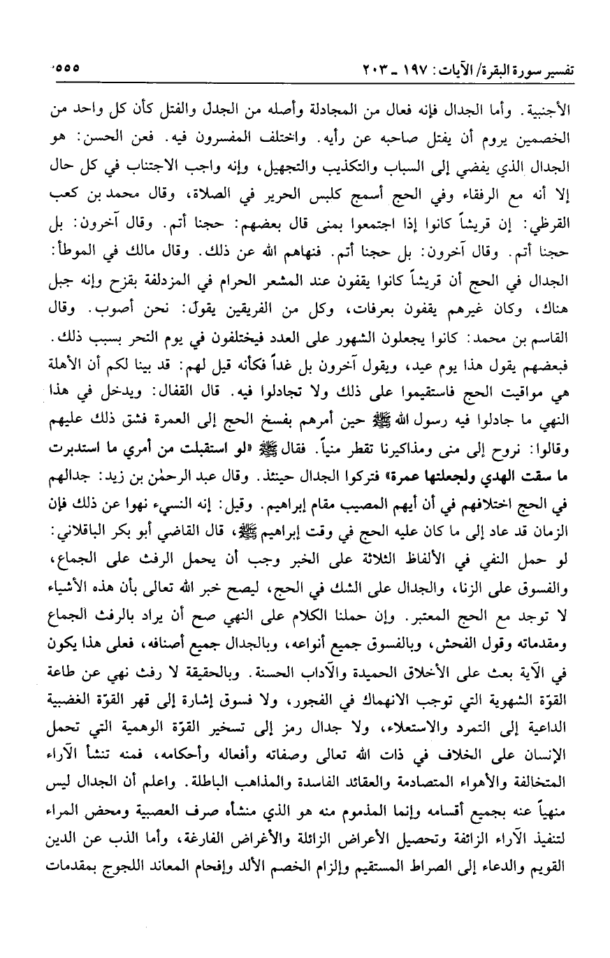 الأجنبية. وأما الجدال فإنه فعال من المجادلة وأصله من الجدل والفتل كأن كل واحد من الخصمين يروم أن يفتل صاحبه عن رأيه. واختلف المفسرون فيه. فعن الحسن: هو الجدال الذي يفضي إلى السباب والتكذيب والتجهيل، وإنه واجب الاجتناب في كل حال إلا أنه مع الرفقاء وفي الحج أسمج كلبس الحرير في الصلاة، وقال محمد بن كعب القرظي: إن قريشا كانوا إذا اجتمعوا بمنى قال بعضهم: حجنا أتم. وقال آخرون: بل حجنا أتم. وقال آخرون: بل حجنا أتم. فنهاهم الله عن ذلك. وقال مالك في الموطأ: