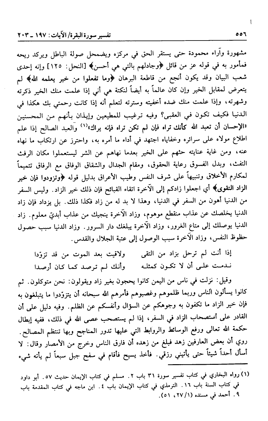 والعبد الصالح إذا علم اطلاع مولاه على سرائره وخفاياه اجتهد في أداء ما أمره به، واحترز عن ارتكاب ما نهاه عنه، ومن غاية عنايته حثهم على الخير بعد ما نهاهم عن الشر ليستعملوا مكان الرفث التفث، وبدل الفسوق رعاية الحقوق، ومقام الجدال والشقاق الوفاق مع الرفاق تتميما لمكارم الأخلاق وتنبيها على شرف النفس وطيب الأعراق بدليل قوله وَتَزَوَّدُوا فَإِنَّ خَيْرَ الزَّادِ التَّقْوى أي اجعلوا زادكم إلى الآخرة اتقاء القبائح فإن ذلك خير الزاد. وليس السفر من الدنيا أهون من السفر في الدنيا، وهذا لا بد له من زاد فكذا ذلك. بل يزداد فإن زاد الدنيا يخلصك عن عذاب منقطع موهوم، وزاد الآخرة ينجيك من عذاب أبديّ معلوم. زاد الدنيا يوصلك إلى متاع الغرور، وزاد الآخرة يبلغك دار السرور. وزاد الدنيا سبب حصول حظوظ النفس، وزاد الآخرة سبب الوصول إلى عتبة الجلال والقدس.