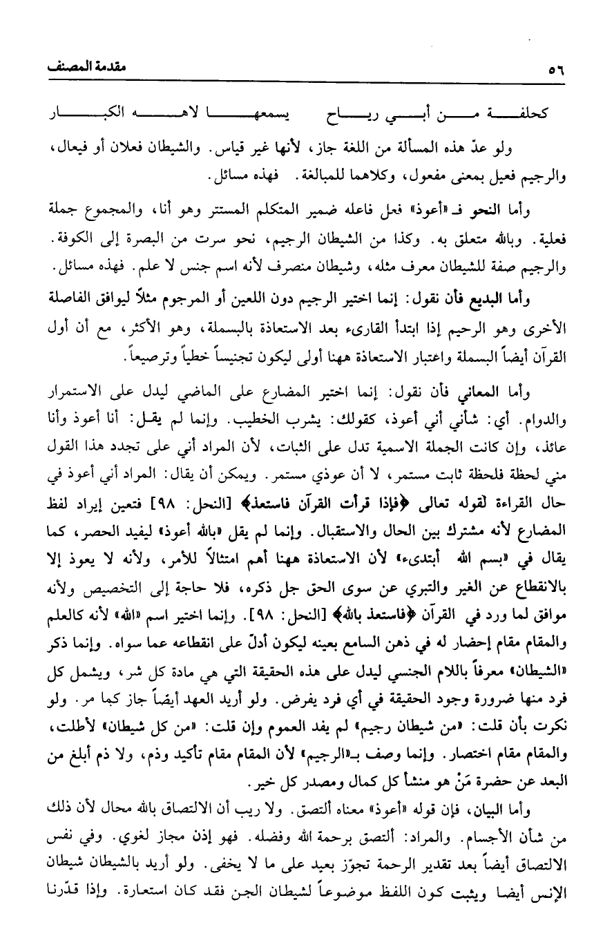 وأما البيان، فإن قوله «أعوذ» معناه ألتصق. ولا ريب أن الالتصاق بالله محال لأن ذلك من شأن الأجسام. والمراد: ألتصق برحمة الله وفضله. فهو إذن مجاز لغوي. وفي نفس الالتصاق أيضا بعد تقدير الرحمة تجوّز بعيد على ما لا يخفى. ولو أريد بالشيطان شيطان الإنس أيضا ويثبت كون اللفظ موضوعا لشيطان الجن فقد كان استعارة. وإذا قدّرنا