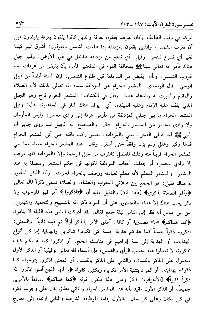 وقال: عند المشعر الحرام معناه مما يلي المشعر الحرام قريبا منه وذلك للفضل كالقرب من جبل الرحمة وإلا فالمزدلفة كلها موقف إلا وادي محسر، أو جعلت أعقاب المزدلفة لكونها في حكم المشعر ومتصلة به عند المشعر. والمشعر المعلم لأنه معلم لعبادته ووصف بالحرام لحرمته. وأما الذكر المأمور به هناك فقيل: هو الجمع بين صلاتي المغرب والعشاء. والصلاة تسمى ذكرا قال تعالى وَأَقِمِ الصَّلاةَ لِذِكْرِي [طه: 14] والدليل عليه أن فَاذْكُرُوا أمر فهو للوجوب ولا ذكر يجب هناك إلا هذا، والجمهور على أن المراد ذكر الله بالتسبيح والتحميد والتهليل.