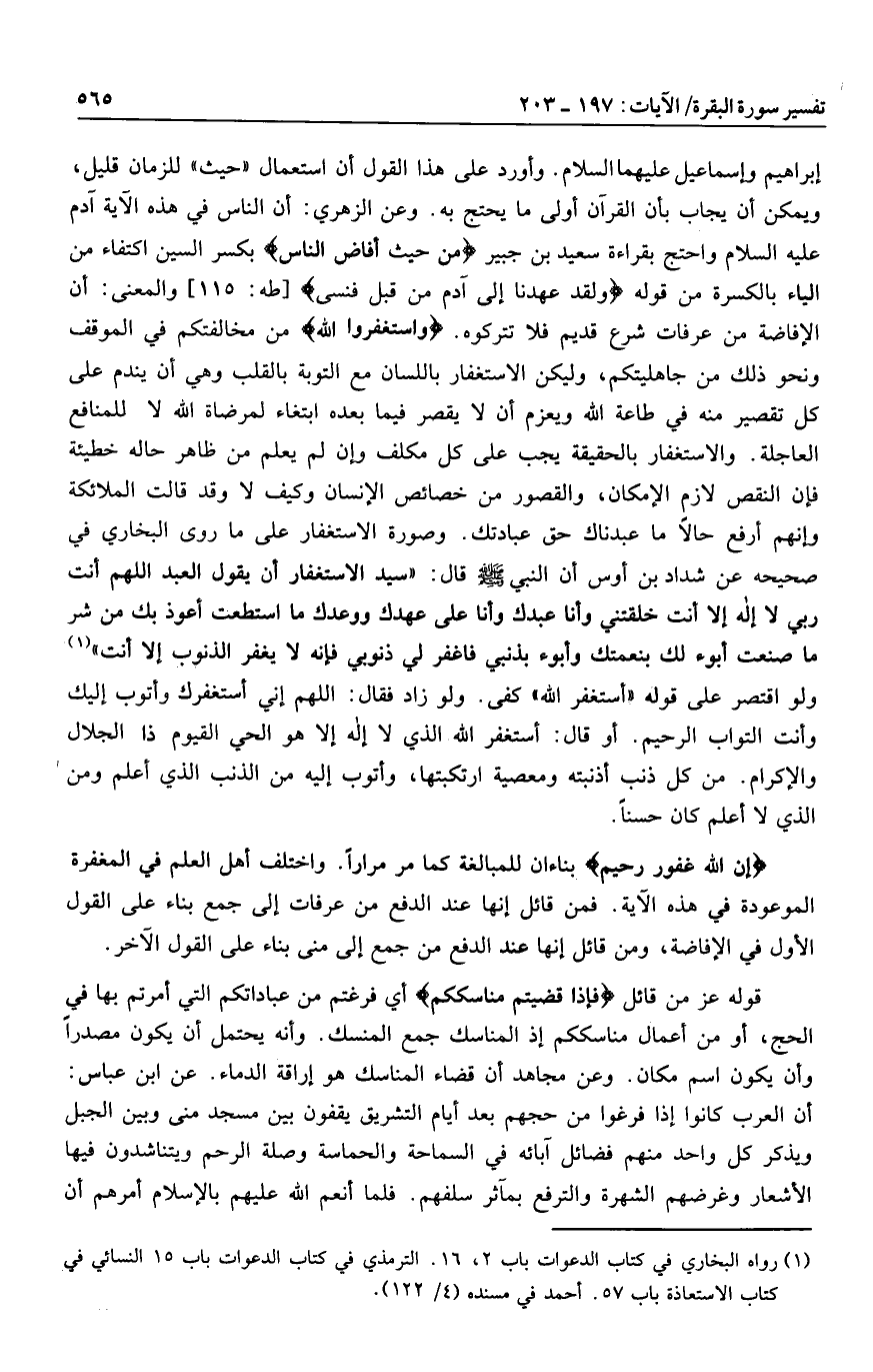 إبراهيم وإسماعيل عليهما السلام. وأورد على هذا القول أن استعمال «حيث» للزمان قليل، ويمكن أن يجاب بأن القرآن أولى ما يحتج به. وعن الزهري: أن الناس في هذه الآية آدم عليه السلام واحتج بقراءة سعيد بن جبير مِنْ حَيْثُ أَفاضَ النَّاسُ بكسر السين اكتفاء من الياء بالكسرة من قوله وَلَقَدْ عَهِدْنا إِلى آدَمَ مِنْ قَبْلُ فَنَسِيَ [طه: 115] والمعنى: أن الإفاضة من عرفات شرع قديم فلا تتركوه. وَاسْتَغْفِرُوا اللَّهَ من مخالفتكم في الموقف ونحو ذلك من جاهليتكم، وليكن الاستغفار باللسان مع التوبة بالقلب وهي أن يندم على كل تقصير منه في طاعة الله ويعزم أن لا يقصر فيما بعده ابتغاء لمرضاة الله لا للمنافع العاجلة. والاستغفار بالحقيقة يجب على كل مكلف وإن لم يعلم من ظاهر حاله خطيئة فإن النقص لازم الإمكان، والقصور من خصائص الإنسان وكيف لا وقد قالت الملائكة وإنهم أرفع حالا ما عبدناك حق عبادتك. وصورة الاستغفار على ما