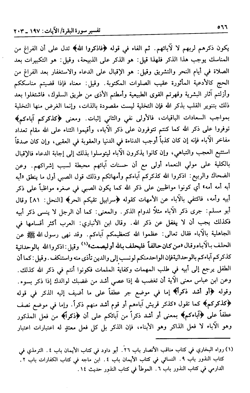 يكون ذكرهم لربهم لا لآبائهم. ثم الفاء في قوله فَاذْكُرُوا اللَّهَ تدل على أن الفراغ من المناسك يوجب هذا الذكر فلهذا قيل: هو الذكر على الذبيحة، وقيل: هو التكبيرات بعد الصلاة في أيام النحر والتشريق وقيل: هو الإقبال على الدعاء والاستغفار بعد الفراغ من الحج كالأدعية المأثورة عقيب الصلوات المكتوبة. وقيل: معناه فإذا قضيتم مناسككم وأزلتم آثار البشرية وقهرتم القوى الطبيعية وأمطتم الأذى من طريق السلوك، فاشتغلوا بعد ذلك بتنوير القلب بذكر الله فإن التخلية ليست مقصودة بالذات، وإنما الغرض منها التخلية بمواجب السعادات الباقيات، فالأولى نفي والثاني إثبات. ومعنى كَذِكْرِكُمْ آباءَكُمْ توفروا على ذكر الله كما كنتم تتوفرون على ذكر الآباء، وأقيموا الثناء على الله مقام تعداد مفاخر الآباء فإنه إن كان كذبا أوجب الدناءة في الدنيا والعقوبة في العقبى، وإن كان صدقا استتبع العجب والتباهي، وإن كانوا يذكرون الآباء ليتوسلوا بذلك إلى إجابة الدعاء فالإقبال بالكلية على مولي النعماء أولى مع أن حسنات آبائهم محبطة لسبب إشراكهم. وعن الضحاك والربيع: اذكروا الله كذكركم آباءكم وأمهاتكم وذلك قول الصبي أول ما ينطق «أبه أبه أمه أمه» أي كونوا مواظبين على ذكر الله كما يكون الصبي في صغره مواظبا على ذكر أبيه وأمه، فاكتفي بالآباء عن الأمهات كقوله سَرابِيلَ تَقِيكُمُ الْحَرَّ [النحل: 81] وقال أبو مسلم: جرى ذكر الآباء مثلا لدوام الذكر. والمعنى: كما أن الرجل لا ينسى ذكر أبيه فكذلك يجب أن لا يغفل عن ذكر الله. وقال ابن الأنباري: العرب أكثر أقسامها في الجاهلية بالآباء فقال تعالى: عظموا الله كتعظيمكم آباءكم.