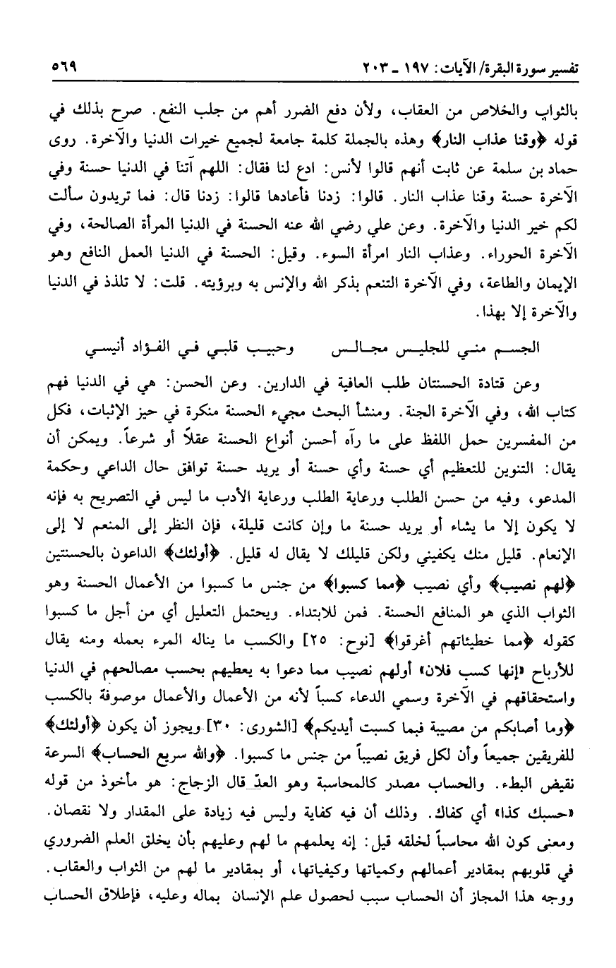 وعن قتادة الحسنتان طلب العافية في الدارين. وعن الحسن: هي في الدنيا فهم كتاب الله، وفي الآخرة الجنة. ومنشأ البحث مجيء الحسنة منكرة في حيز الإثبات، فكل من المفسرين حمل اللفظ على ما رآه أحسن أنواع الحسنة عقلا أو شرعا. ويمكن أن يقال: التنوين للتعظيم أي حسنة وأي حسنة أو يريد حسنة توافق حال الداعي وحكمة المدعو، وفيه من حسن الطلب ورعاية الطلب ورعاية الأدب ما ليس في التصريح به فإنه لا يكون إلا ما يشاء أو يريد حسنة ما وإن كانت قليلة، فإن النظر إلى المنعم لا إلى الإنعام. قليل منك يكفيني ولكن قليلك لا يقال له قليل. أُولئِكَ الداعون بالحسنتين لَهُمْ نَصِيبٌ وأي نصيب مِمَّا كَسَبُوا من جنس ما كسبوا من الأعمال الحسنة وهو الثواب الذي هو المنافع الحسنة. فمن للابتداء. ويحتمل التعليل أي من أجل ما كسبوا كقوله مِمَّا خَطِيئاتِهِمْ أُغْرِقُوا [نوح: 25] والكسب ما يناله المرء بعمله ومنه يقال للأرباح «إنها كسب فلان» أولهم نصيب مما دعوا به يعطيهم بحسب مصالحهم في الدنيا واستحقاقهم في الآخرة وسمي الدعاء كسبا لأنه من الأعمال والأعمال موصوفة بالكسب وَما أَصابَكُمْ مِنْ مُصِيبَةٍ فَبِما كَسَبَتْ أَيْدِيكُمْ [الشورى: 30] ويجوز أن يكون أُولئِكَ للفريقين جميعا وأن لكل فريق نصيبا من جنس ما كسبوا. وَاللَّهُ سَرِيعُ الْحِسابِ السرعة نقيض البطء. والحساب مصدر كالمحاسبة وهو العدّ قال الزجاج: هو مأخوذ من قوله «حسبك كذا» أي كفاك. وذلك أن فيه كفاية وليس فيه زيادة على المقدار ولا نقصان.