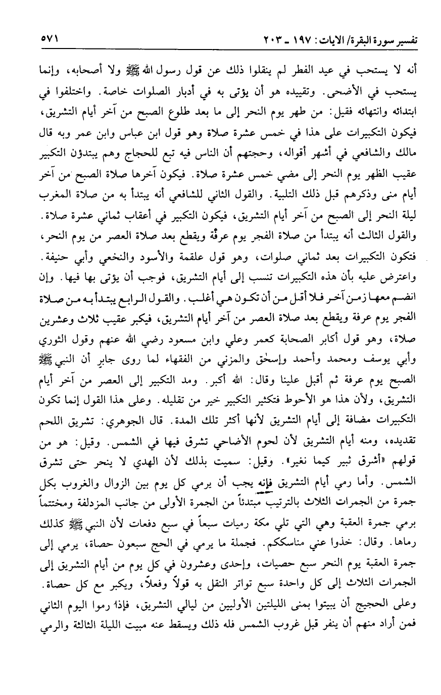 واعترض عليه بأن هذه التكبيرات تنسب إلى أيام التشريق، فوجب أن يؤتى بها فيها. وإن انضم معها زمن آخر فلا أقل من أن تكون هي أغلب. والقول الرابع يبتدأ به من صلاة الفجر يوم عرفة ويقطع بعد صلاة العصر من آخر أيام التشريق، فيكبر عقيب ثلاث وعشرين صلاة، وهو قول أكابر الصحابة كعمر وعلي وابن مسعود رضي الله عنهم وقول الثوري وأبي يوسف ومحمد وأحمد وإسحق والمزني من الفقهاء لما