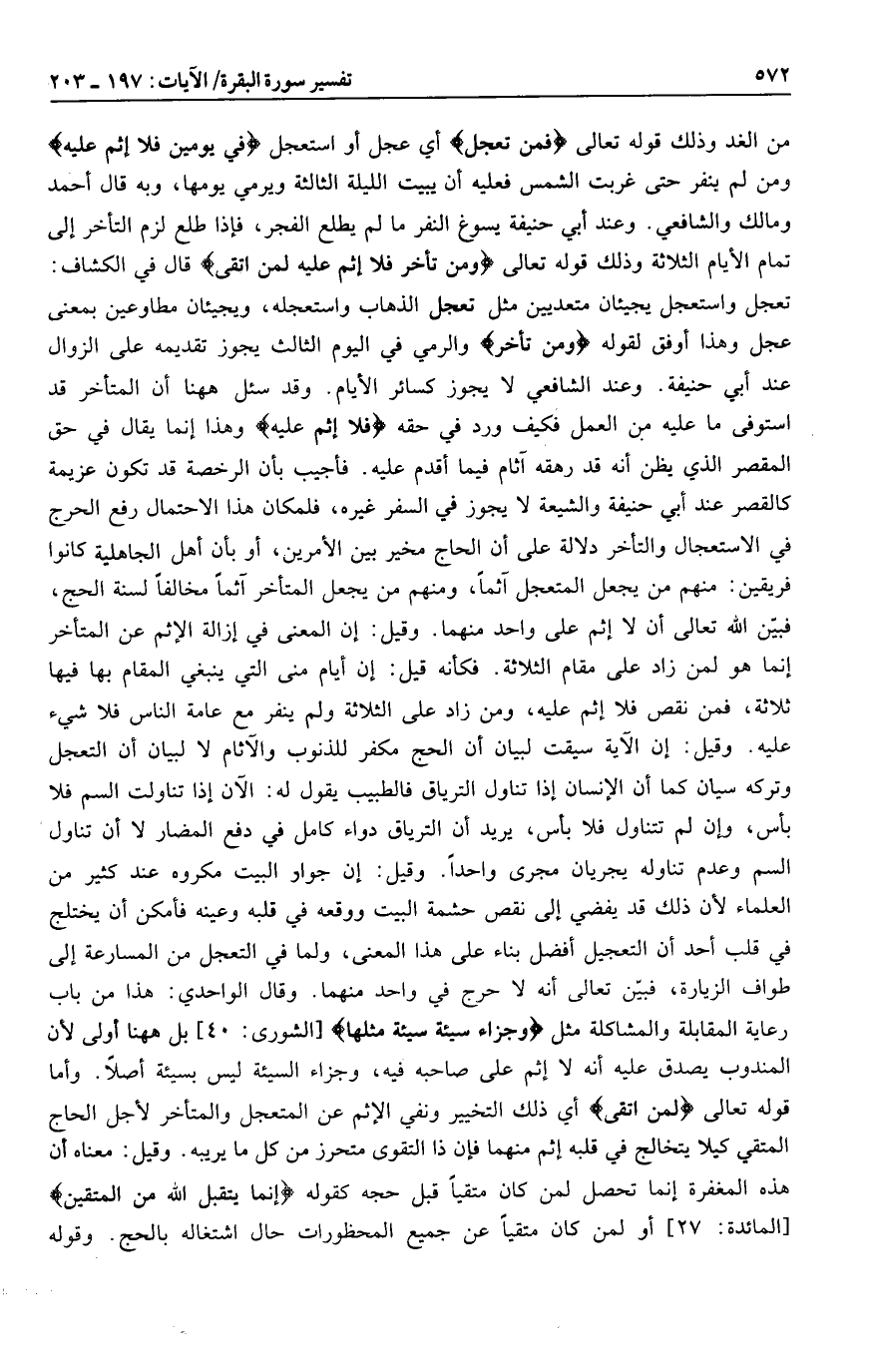 تعجل واستعجل يجيئان متعديين مثل تعجل الذهاب واستعجله، ويجيئان مطاوعين بمعنى عجل وهذا أوفق لقوله وَمَنْ تَأَخَّرَ والرمي في اليوم الثالث يجوز تقديمه على الزوال عند أبي حنيفة. وعند الشافعي لا يجوز كسائر الأيام. وقد سئل هاهنا أن المتأخر قد استوفى ما عليه من العمل فكيف ورد في حقه فَلا إِثْمَ عَلَيْهِ وهذا إنما يقال في حق المقصر الذي يظن أنه قد رهقه آثام فيما أقدم عليه. فأجيب بأن الرخصة قد تكون عزيمة كالقصر عند أبي حنيفة والشيعة لا يجوز في السفر غيره، فلمكان هذا الاحتمال رفع الحرج في الاستعجال والتأخر دلالة على أن الحاج مخير بين الأمرين، أو بأن أهل الجاهلية كانوا فريقين: منهم من يجعل المتعجل آثما، ومنهم من يجعل المتأخر آثما مخالفا لسنة الحج، فبيّن الله تعالى أن لا إثم على واحد منهما. وقيل: إن المعنى في إزالة الإثم عن المتأخر إنما هو لمن زاد على مقام الثلاثة. فكأنه قيل: إن أيام منى التي ينبغي المقام بها فيها ثلاثة، فمن نقص فلا إثم عليه، ومن زاد على الثلاثة ولم ينفر مع عامة الناس فلا شيء عليه. وقيل: إن الآية سيقت لبيان أن الحج مكفر للذنوب والآثام لا لبيان أن التعجل وتركه سيان كما أن الإنسان إذا تناول الترياق فالطبيب يقول له: الآن إذا تناولت السم فلا بأس، وإن لم تتناول فلا بأس، يريد أن الترياق دواء كامل في دفع المضار لا أن تناول السم وعدم تناوله يجريان مجرى واحدا. وقيل: إن جوار البيت مكروه عند كثير من العلماء لأن ذلك قد يفضي إلى نقص حشمة البيت ووقعه في قلبه وعينه فأمكن أن يختلج في قلب أحد أن التعجيل أفضل بناء على هذا المعنى، ولما في التعجل من المسارعة إلى طواف الزيارة، فبيّن تعالى أنه لا حرج في واحد منهما. وقال الواحدي: هذا من باب رعاية المقابلة والمشاكلة مثل وَجَزاءُ سَيِّئَةٍ سَيِّئَةٌ مِثْلُها [الشورى: 40] بل هاهنا أولى لأن المندوب يصدق عليه أنه لا إثم على صاحبه فيه، وجزاء السيئة ليس بسيئة أصلا. وأما قوله تعالى لِمَنِ اتَّقى أي ذلك التخيير ونفي الإثم عن المتعجل والمتأخر لأجل الحاج المتقي كيلا يتخالج في قلبه إثم منهما فإن ذا التقوى متحرز من كل ما يريبه. وقيل: معناه أن هذه المغفرة إنما تحصل لمن كان متقيا قبل حجه كقوله إِنَّما يَتَقَبَّلُ اللَّهُ مِنَ الْمُتَّقِينَ [المائدة: 27] أو لمن كان متقيا عن جميع المحظورات حال اشتغاله بالحج. وقوله