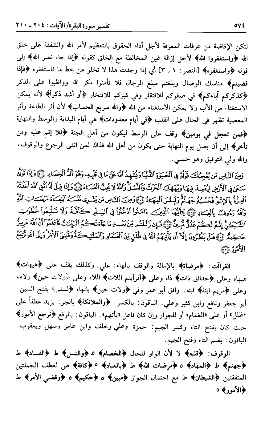 قَلْبِهِ لا لأن الواو للحال الْخِصامِ هـ وَالنَّسْلَ ط الْفَسادَ ط جَهَنَّمُ ط الْمِهادُ هـ مَرْضاتِ اللَّهِ ط بِالْعِبادِ هـ كَافَّةً ص لعطف الجملتين المتفقتين الشَّيْطانِ ط مع احتمال الجواز مُبِينٌ هـ حَكِيمٌ هـ وَقُضِيَ الْأَمْرُ ط الْأُمُورُ هـ