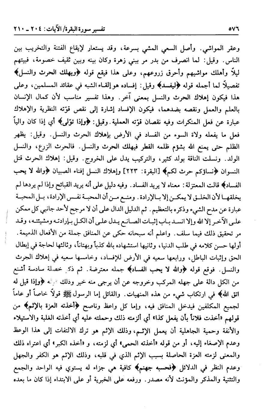 وعقر المواشي. وأصل السعي المشي بسرعة، وقد يستعار لإيقاع الفتنة والتخريب بين الناس. وقيل: لما انصرف من بدر مر ببني زهرة وكان بينه وبين ثقيف خصومة، فبيتهم ليلا وأهلك مواشيهم وأحرق زروعهم، وعلى هذا فيقع قوله وَيُهْلِكَ الْحَرْثَ وَالنَّسْلَ تفصيلا لما أجمله قوله لِيُفْسِدَ وقيل: إفساده هو إلقاء الشبه في عقائد المسلمين، وعلى هذا فيكون إهلاك الحرث والنسل بمعنى آخر. وهذا تفسير مناسب لأن كمال الإنسان بالعلم والعمل ونقصه بضدهما، فيكون الإفساد إشارة إلى نقص قوّته النظرية والإهلاك عبارة عن فعل المنكرات وفيه نقصان قوّته العملية. وقيل: وَإِذا تَوَلَّى أي إذا كان واليا فعل ما يفعله ولاة السوء من الفساد في الأرض بإهلاك الحرث والنسل. وقيل: يظهر الظلم حتى يمنع الله بشؤم ظلمه القطر فيهلك الحرث والنسل. فالحرث الزرع، والنسل الولد. ونسلت الناقة بولد كثير، والتركيب يدل على الخروج. وقيل: إهلاك الحرث قتل النسوان نِساؤُكُمْ حَرْثٌ لَكُمْ [البقرة: 223] وإهلاك النسل إفناء الصبيان وَاللَّهُ لا يُحِبُّ الْفَسادَ قالت المعتزلة: معناه لا يريد الفساد. وفيه دليل على أنه يريد القبائح وإذا لم يردها لم يخلقها لأن الخلق لا يمكن إلا بالإرادة. ومنع من أن المحبة نفس الإرادة، بل المحبة عبارة عن مدح الشيء وذكره بالتعظيم. ثم الدليل الدال على أن لا مرجح لأحد جانبي كل ممكن على الآخر إلا الله وإلا انسد باب إثبات الصانع يدل على أن الكل بإرادته ومشيئته، وقد مر تحقيق ذلك فيما سلف. واعلم أنه سبحانه حكى عن المنافق جملة من الأفعال الذميمة.