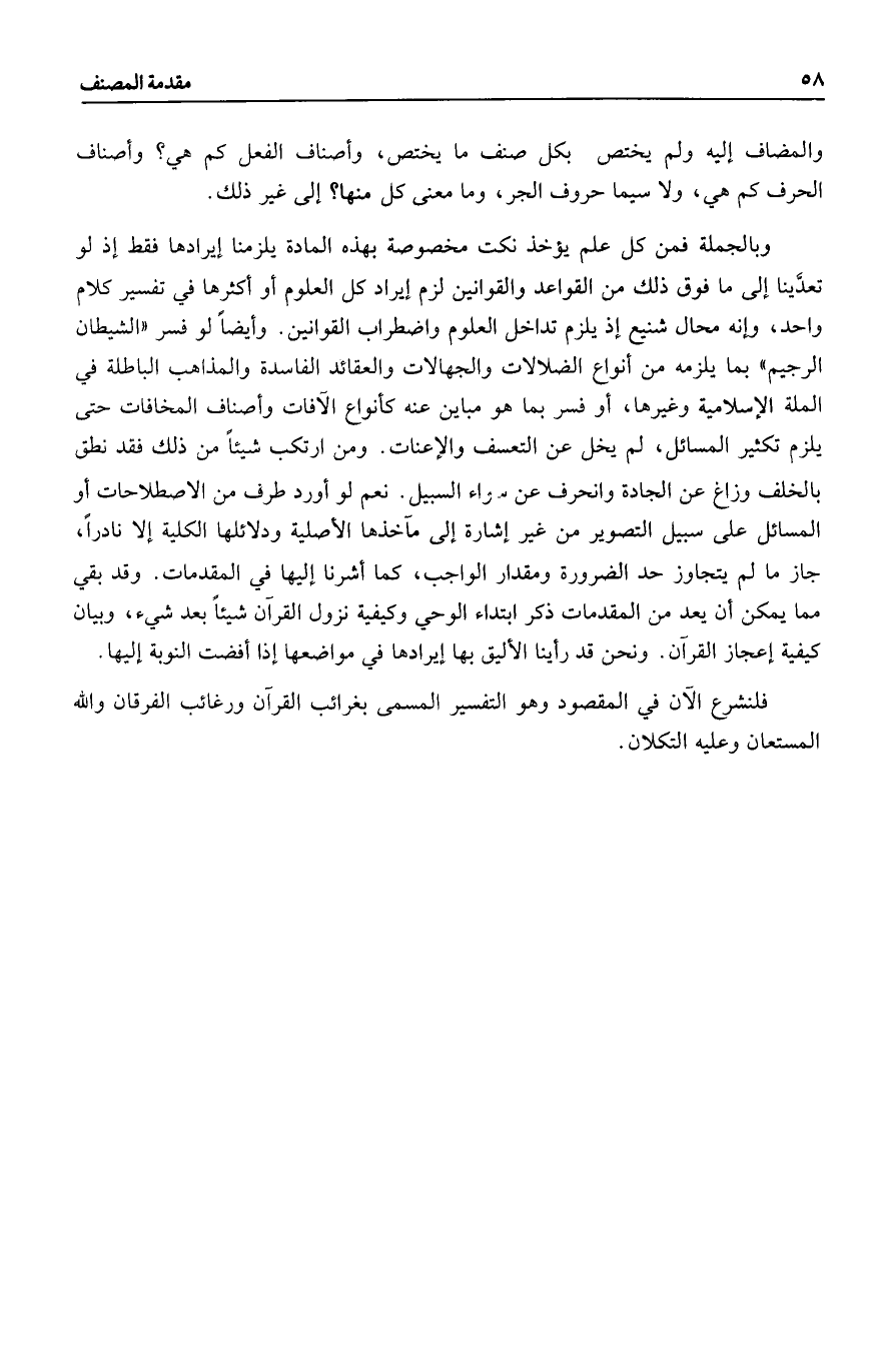 وبالجملة فمن كل علم يؤخذ نكت مخصوصة بهذه المادة يلزمنا إيرادها فقط إذ لو تعدّينا إلى ما فوق ذلك من القواعد والقوانين لزم إيراد كل العلوم أو أكثرها في تفسير كلام واحد، وإنه محال شنيع إذ يلزم تداخل العلوم واضطراب القوانين. وأيضا لو فسر «الشيطان الرجيم» بما يلزمه من أنواع الضلالات والجهالات والعقائد الفاسدة والمذاهب الباطلة في الملة الإسلامية وغيرها، أو فسر بما هو مباين عنه كأنواع الآفات وأصناف المخافات حتى يلزم تكثير المسائل، لم يخل عن التعسف والإعنات. ومن ارتكب شيئا من ذلك فقد نطق بالخلف وزاغ عن الجادة وانحرف عن سواء السبيل. نعم لو أورد طرف من الاصطلاحات أو المسائل على سبيل التصوير من غير إشارة إلى مآخذها الأصلية ودلائلها الكلية إلا نادرا، جاز ما لم يتجاوز حد الضرورة ومقدار الواجب، كما أشرنا إليها في المقدمات. وقد بقي مما يمكن أن يعد من المقدمات ذكر ابتداء الوحي وكيفية نزول القرآن شيئا بعد شيء، وبيان كيفية إعجاز القرآن. ونحن قد رأينا الأليق بها إيرادها في مواضعها إذا أفضت النوبة إليها.