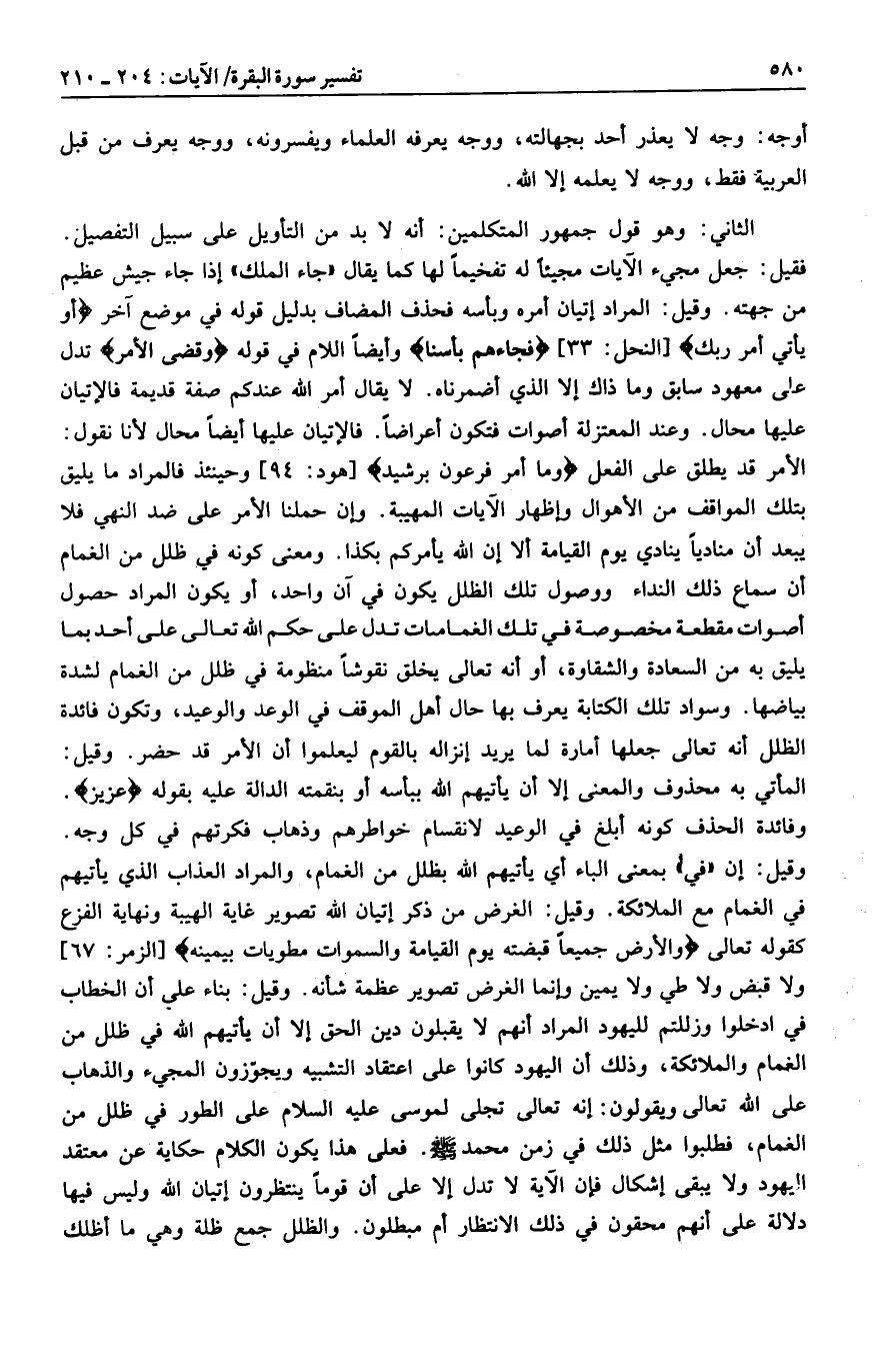 وقيل: إن «في» بمعنى الباء أي يأتيهم الله بظلل من الغمام، والمراد العذاب الذي يأتيهم في الغمام مع الملائكة. وقيل: الغرض من ذكر إتيان الله تصوير غاية الهيبة ونهاية الفزع كقوله تعالى وَالْأَرْضُ جَمِيعاً قَبْضَتُهُ يَوْمَ الْقِيامَةِ وَالسَّماواتُ مَطْوِيَّاتٌ بِيَمِينِهِ [الزمر: 67] ولا قبض ولا طي ولا يمين وإنما الغرض تصوير عظمة شأنه. وقيل: بناء علي أن الخطاب في ادخلوا وزللتم لليهود المراد أنهم لا يقبلون دين الحق إلا أن يأتيهم الله في ظلل من الغمام والملائكة، وذلك أن اليهود كانوا على اعتقاد التشبيه ويجوّزون المجيء والذهاب على الله تعالى ويقولون: إنه تعالى تجلى لموسى عليه السلام على الطور في ظلل من الغمام، فطلبوا مثل ذلك في زمن محمد صلى الله عليه وسلم. فعلى هذا يكون الكلام حكاية عن معتقد اليهود ولا يبقى إشكال فإن الآية لا تدل إلا على أن قوما ينتظرون إتيان الله وليس فيها دلالة على أنهم محقون في ذلك الانتظار أم مبطلون. والظلل جمع ظلة وهي ما أظلك