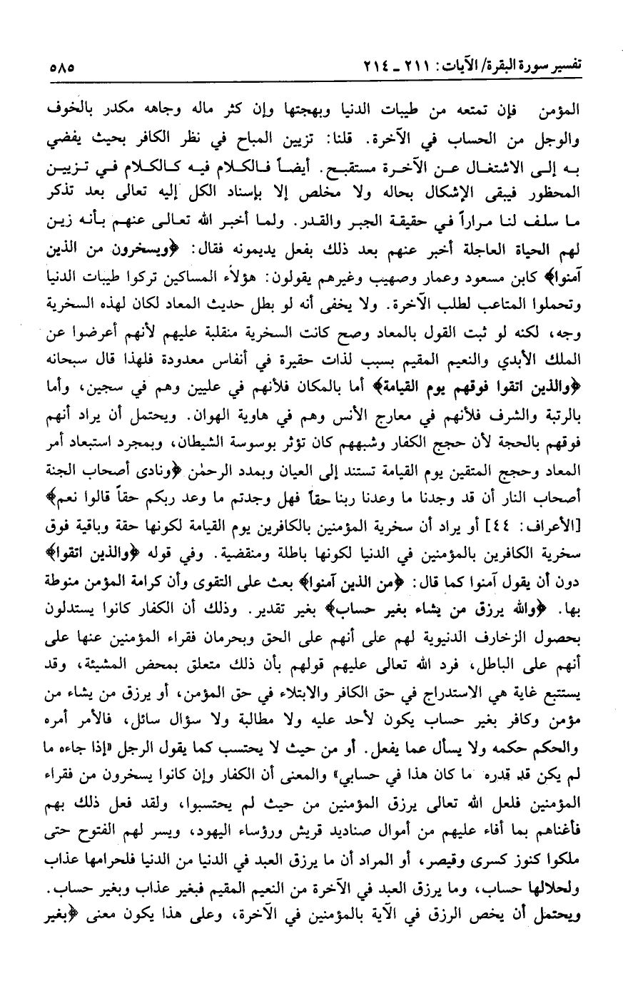 المؤمن فإن تمتعه من طيبات الدنيا وبهجتها وإن كثر ماله وجاهه مكدر بالخوف والوجل من الحساب في الآخرة. قلنا: تزيين المباح في نظر الكافر بحيث يفضي به إلى الاشتغال عن الآخرة مستقبح. أيضا فالكلام فيه كالكلام في تزيين المحظور فيبقى الإشكال بحاله ولا مخلص إلا بإسناد الكل إليه تعالى بعد تذكر ما سلف لنا مرارا في حقيقة الجبر والقدر. ولما أخبر الله تعالى عنهم بأنه زين لهم الحياة العاجلة أخبر عنهم بعد ذلك بفعل يديمونه فقال: وَيَسْخَرُونَ مِنَ الَّذِينَ آمَنُوا كابن مسعود وعمار وصهيب وغيرهم يقولون: هؤلاء المساكين تركوا طيبات الدنيا وتحملوا المتاعب لطلب الآخرة. ولا يخفى أنه لو بطل حديث المعاد لكان لهذه السخرية وجه، لكنه لو ثبت القول بالمعاد وصح كانت السخرية منقلبة عليهم لأنهم أعرضوا عن الملك الأبدي والنعيم المقيم بسبب لذات حقيرة في أنفاس معدودة فلهذا قال سبحانه وَالَّذِينَ اتَّقَوْا فَوْقَهُمْ يَوْمَ الْقِيامَةِ أما بالمكان فلأنهم في عليين وهم في سجين، وأما بالرتبة والشرف فلأنهم في معارج الأنس وهم في هاوية الهوان. ويحتمل أن يراد أنهم فوقهم بالحجة لأن حجج الكفار وشبههم كان تؤثر بوسوسة الشيطان، وبمجرد استبعاد أمر المعاد وحجج المتقين يوم القيامة تستند إلى العيان وبمدد الرحمن وَنادى أَصْحابُ الْجَنَّةِ أَصْحابَ النَّارِ أَنْ قَدْ وَجَدْنا ما وَعَدَنا رَبُّنا حَقًّا فَهَلْ وَجَدْتُمْ ما وَعَدَ رَبُّكُمْ حَقًّا قالُوا نَعَمْ [الأعراف: 44] أو يراد أن سخرية المؤمنين بالكافرين يوم القيامة لكونها حقة وباقية فوق سخرية الكافرين بالمؤمنين في الدنيا لكونها باطلة ومنقضية. وفي قوله وَالَّذِينَ اتَّقَوْا دون أن يقول آمنوا كما قال: مِنَ الَّذِينَ آمَنُوا بعث على التقوى وأن كرامة المؤمن منوطة بها. وَاللَّهُ يَرْزُقُ مَنْ يَشاءُ بِغَيْرِ حِسابٍ بغير تقدير. وذلك أن الكفار كانوا يستدلون بحصول الزخارف الدنيوية لهم على أنهم على الحق وبحرمان فقراء المؤمنين عنها على أنهم على الباطل، فرد الله تعالى عليهم قولهم بأن ذلك متعلق بمحض المشيئة، وقد يستتبع غاية هي الاستدراج في حق الكافر والابتلاء في حق المؤمن، أو يرزق من يشاء من مؤمن وكافر بغير حساب يكون لأحد عليه ولا مطالبة ولا سؤال سائل، فالأمر أمره والحكم حكمه ولا يسأل عما يفعل. أو من حيث لا يحتسب كما يقول الرجل «إذا جاءه ما لم يكن قد قدره ما كان هذا في حسابي» والمعنى أن الكفار وإن كانوا يسخرون من فقراء المؤمنين فلعل الله تعالى يرزق المؤمنين من حيث لم يحتسبوا، ولقد فعل ذلك بهم فأغناهم بما أفاء عليهم من أموال صناديد قريش ورؤساء اليهود، ويسر لهم الفتوح حتى ملكوا كنوز كسرى وقيصر، أو المراد أن ما يرزق العبد في الدنيا من الدنيا فلحرامها عذاب ولحلالها حساب، وما يرزق العبد في الآخرة من النعيم المقيم فبغير عذاب وبغير حساب.