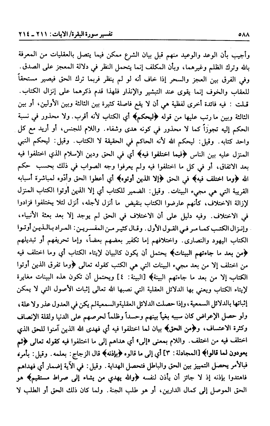 قلت: فيه فائدة أخرى لفظية هي أن لا يقع فاصلة كثيرة بين الثالثة وبين الأولين، أو بين الثالثة وبين ما رتب عليها من قوله لِيَحْكُمَ أي الكتاب لأنه أقرب. ولا محذور في نسبة الحكم إليه تجوزا كما لا محذور في كونه هدى وشفاء. واللام للجنس، أو أريد مع كل واحد كتابه. وقيل: ليحكم الله لأنه الحاكم في الحقيقة لا الكتاب. وقيل: ليحكم النبي المنزل عليه بين الناس فِيمَا اخْتَلَفُوا فِيهِ أي في الحق ودين الإسلام الذي اختلفوا فيه بعد الاتفاق، أو في كل ما اختلفوا فيه ولم يعرفوا وجه الصواب في ذلك بحسب حكم الله وَمَا اخْتَلَفَ فِيهِ في الحق إِلَّا الَّذِينَ أُوتُوهُ أي أعطوا الحق وأدّوه لمباشرة أسبابه القريبة التي هي مجيء البينات. وقيل: الضمير للكتاب أي إلا الذين أوتوا الكتاب المنزل لإزالة الاختلاف، كأنهم عارضوا الكتاب بنقيض ما أنزل لأجله، أنزل لئلا يختلفوا فزادوا في الاختلاف. وفيه دليل على أن الاختلاف في الحق لم يوجد إلا بعد بعثة الأنبياء، وإنزال الكتب كما مر في القول الأول. وقال كثير من المفسرين: المراد بالذين أوتوا الكتاب اليهود والنصارى. واختلافهم إما تكفير بعضهم بعضا، وإما تحريفهم أو تبديلهم مِنْ بَعْدِ ما جاءَتْهُمُ الْبَيِّناتُ يحتمل أن يكون كالبيان لإيتاء الكتاب أي وما اختلف فيه من اختلف إلا من بعد مجيء البينات التي هي الكتب كقوله تعالى وَما تَفَرَّقَ الَّذِينَ أُوتُوا الْكِتابَ إِلَّا مِنْ بَعْدِ ما جاءَتْهُمُ الْبَيِّنَةُ [البينة: 4] ويحتمل أن تكون هذه البينات مغايرة لإيتاء الكتاب ويعني بها الدلائل العقلية التي نصبها الله تعالى إثبات الأصول التي لا يمكن إثباتها بالدلائل السمعية، وإذا حصلت الدلائل العقلية والسمعية لم يكن في العدول عذر ولا علة، ولو حصل الإعراض كان سببه بغيا بينهم وحسدا وظلما لحرصهم على الدنيا ولقلة الإنصاف وكثرة الاعتساف، ومِنَ الْحَقِّ بيان لما اختلفوا فيه أي فهدى الله الذين آمنوا للحق الذي اختلف فيه من اختلف. واللام بمعنى «إلى» أي هداهم إلى ما اختلفوا فيه كقوله تعالى ثُمَّ يَعُودُونَ لِما قالُوا [المجادلة: 3] أي إلى ما قالوه بِإِذْنِهِ قال الزجاج: بعلمه. وقيل: بأمره فبالأمر يحصل التمييز بين الحق والباطل فتحصل الهداية. وقيل: في الآية إضمار أي فهداهم فاهتدوا بإذنه إذ لا جائز أن يأذن لنفسه وَاللَّهُ يَهْدِي مَنْ يَشاءُ إِلى صِراطٍ مُسْتَقِيمٍ هو الحق الموصل إلى كمال الدارين، أو هو طلب الجنة. ولما كان ذلك الحق أو الطلب لا
