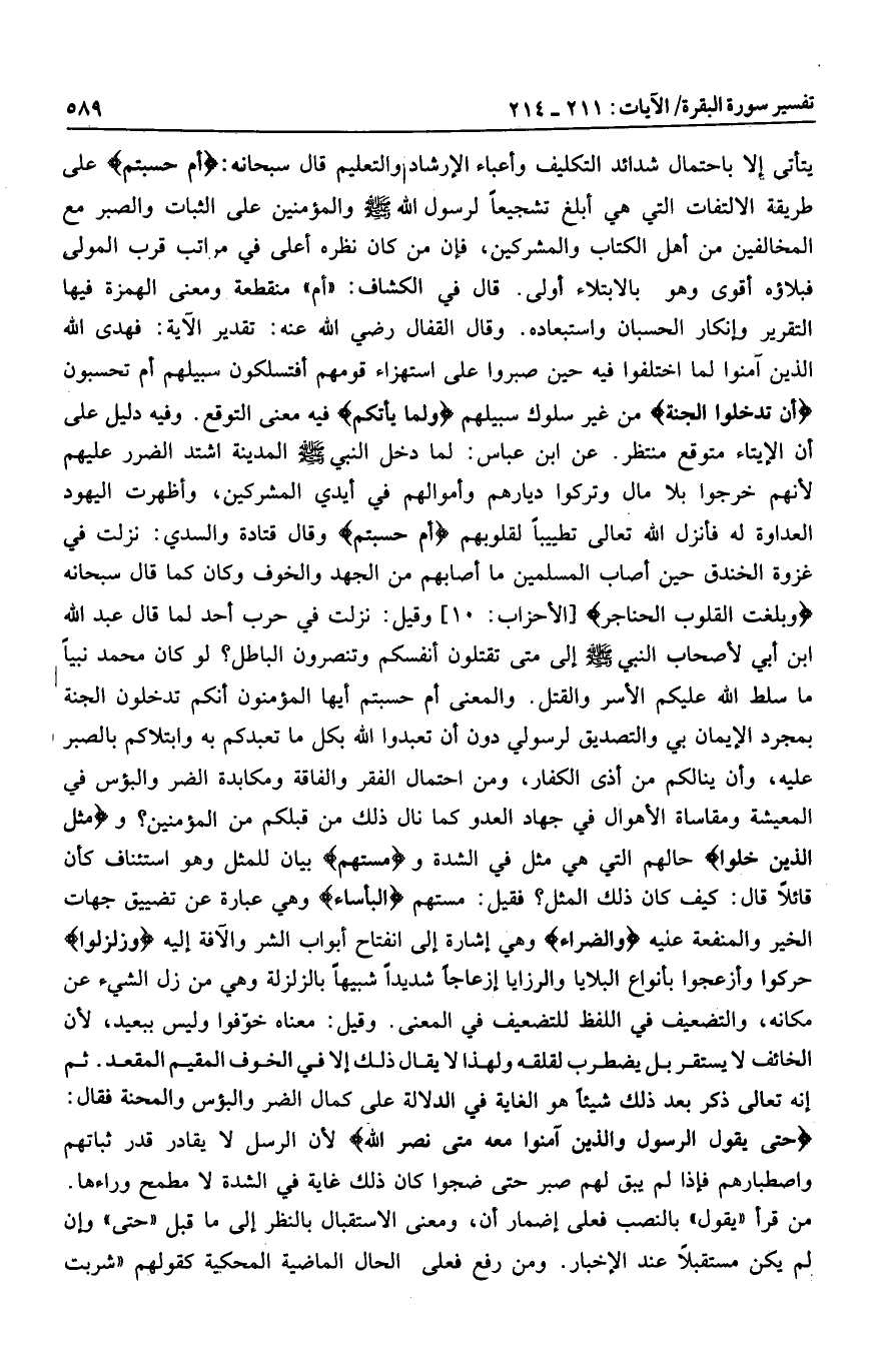 وقال قتادة والسدي: نزلت في غزوة الخندق حين أصاب المسلمين ما أصابهم من الجهد والخوف وكان كما قال سبحانه وَبَلَغَتِ الْقُلُوبُ الْحَناجِرَ [الأحزاب: 10] وقيل: نزلت في حرب أحد لما قال عبد الله ابن أبي لأصحاب النبي صلى الله عليه وسلم إلى متى تقتلون أنفسكم وتنصرون الباطل؟ لو كان محمد نبيا ما سلط الله عليكم الأسر والقتل. والمعنى أم حسبتم أيها المؤمنون أنكم تدخلون الجنة بمجرد الإيمان بي والتصديق لرسولي دون أن تعبدوا الله بكل ما تعبدكم به وابتلاكم بالصبر عليه، وأن ينالكم من أذى الكفار، ومن احتمال الفقر والفاقة ومكابدة الضر والبؤس في المعيشة ومقاساة الأهوال في جهاد العدو كما نال ذلك من قبلكم من المؤمنين؟ ومَثَلُ الَّذِينَ خَلَوْا حالهم التي هي مثل في الشدة ومَسَّتْهُمُ بيان للمثل وهو استئناف كأن قائلا قال: كيف كان ذلك المثل؟ فقيل: مستهم الْبَأْساءُ وهي عبارة عن تضييق جهات الخير والمنفعة عليه وَالضَّرَّاءُ وهي إشارة إلى انفتاح أبواب الشر والآفة إليه وَزُلْزِلُوا حركوا وأزعجوا بأنواع البلايا والرزايا إزعاجا شديدا شبيها بالزلزلة وهي من زل الشيء عن مكانه، والتضعيف في اللفظ للتضعيف في المعنى. وقيل: معناه خوّفوا وليس ببعيد، لأن الخائف لا يستقر بل يضطرب لقلقه ولهذا لا يقال ذلك إلا في الخوف المقيم المقعد. ثم إنه تعالى ذكر بعد ذلك شيئا هو الغاية في الدلالة على كمال الضر والبؤس والمحنة فقال: