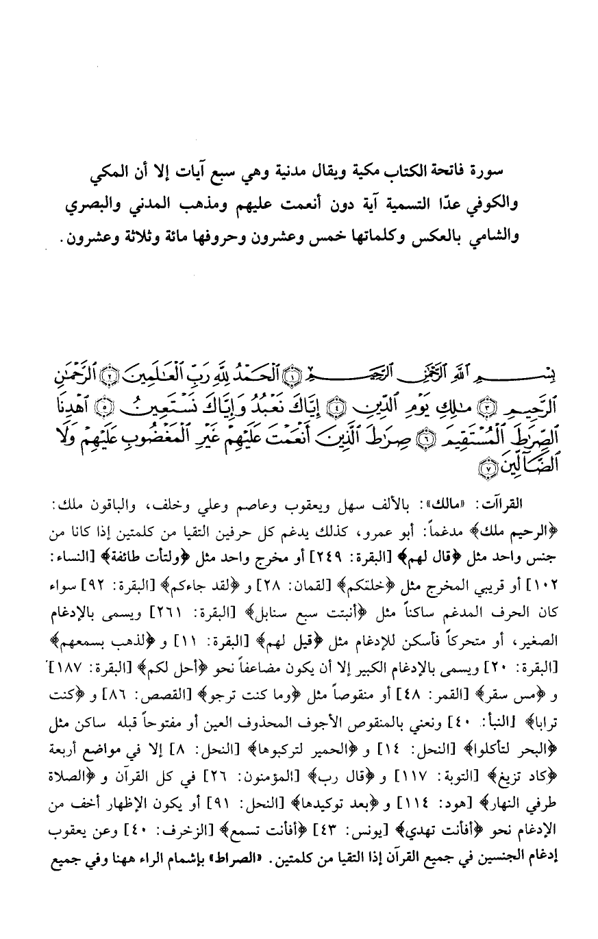 (مكية ويقال مدنية وهي سبع آيات إلا أن المكي والكوفي عدّا التسمية آية دون أنعمت عليهم ومذهب المدني والبصري والشامي بالعكس وكلماتها خمس وعشرون وحروفها مائة وثلاثة وعشرون.)