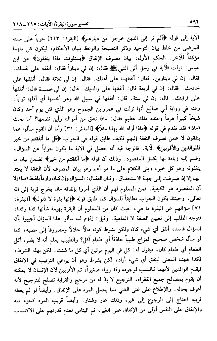 71] سؤالهم عن البقرة ما هي، حيث كان من المعلوم أن البقرة بهيمة شأنها كذا وكذا، فتوجه الطلب إلى تعيين الصفة لا الماهية. وقيل: إنهم لما سألوا هذا السؤال أجيبوا بأن السؤال فاسد، أنفق أي شيء كان ولكن بشرط كونه مالا حلالا ومصروفا إلى مصبه، كما لو سأل شخص صحيح المزاج طبيبا حاذقا أي طعام آكل؟ والطبيب يعلم أنه لا يضره أكل الطعام أي طعام كان، فيقول له: كل في اليوم مرتين أي كل ما شئت. لكن بهذا الشرط، فكذا هاهنا المعنى لينفق أي شيء أراد، لكن بشرط وهو أن يراعي الترتيب في الإنفاق فيقدم الوالدين لأنهما كالسبب لوجوده وقد ربياه صغيرا، ثم الأقربين لأن الإنسان لا يمكنه أن يقوم بمصالح جميع الفقراء، الترجيح لا بدّ له من مرحج والقرابة تصلح للترجيح لأنه أعرف بحاله. والإطلاع على غنى الغني مما يحمل المرء على الإنفاق. وأيضا لو لم يعطه قريبه احتاج إلى الرجوع إلى غيره وذلك عار وشنار. وأيضا قريب المرء كجزء منه والإنفاق على النفس أولى من الإنفاق على الغير، ثم اليتامى لعدم قدرتهم على الاكتساب