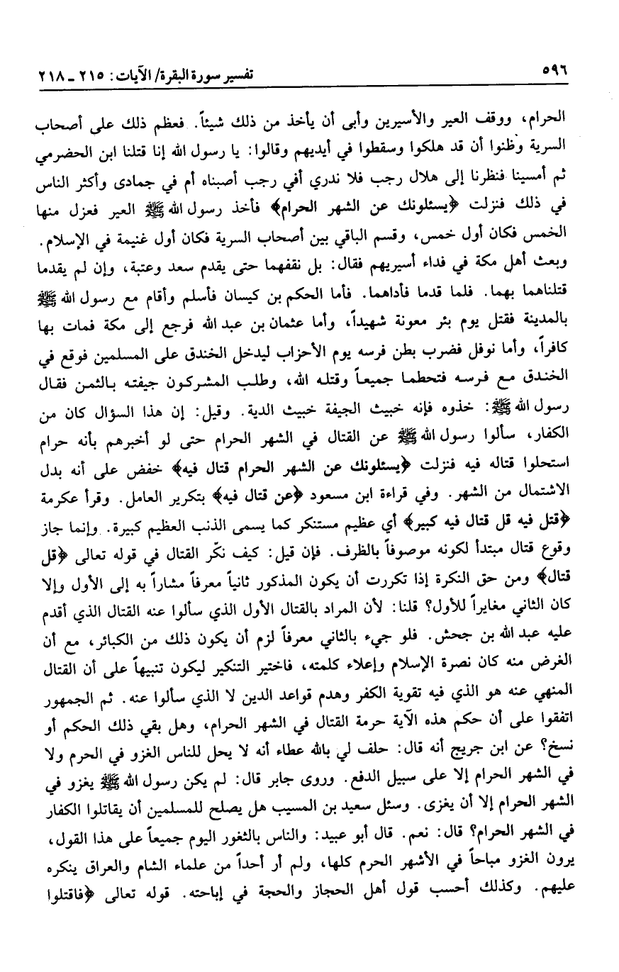 الحرام، ووقف العير والأسيرين وأبى أن يأخذ من ذلك شيئا. فعظم ذلك على أصحاب السرية وظنوا أن قد هلكوا وسقطوا في أيديهم وقالوا: يا رسول الله إن قتلنا ابن الحضرمي ثم أمسينا فنظرنا إلى هلال رجب فلا ندري أفي رجب أصبناه أم في جمادى وأكثر الناس في ذلك فنزلت يَسْئَلُونَكَ عَنِ الشَّهْرِ الْحَرامِ فأخذ رسول الله صلى الله عليه وسلم العير فعزل منها الخمس فكان أول خمس، وقسم الباقي بين أصحاب السرية فكان أول غنيمة في الإسلام.