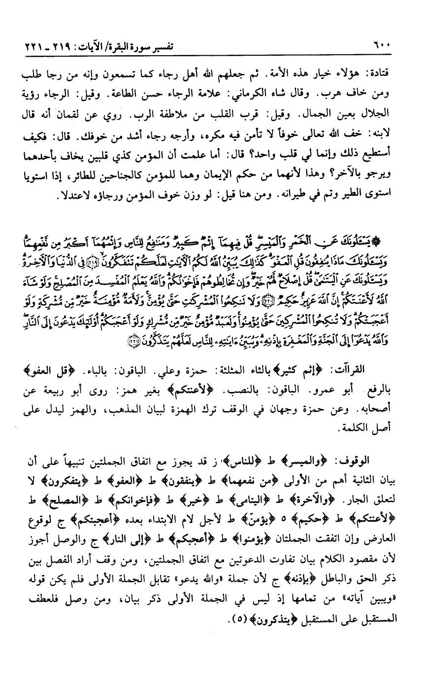 وَالْمَيْسِرِ ط لِلنَّاسِ ز قد يجوز مع اتفاق الجملتين تنبيها على أن بيان الثانية أهم من الأولى مِنْ نَفْعِهِما ط يُنْفِقُونَ ط الْعَفْوَ ط تَتَفَكَّرُونَ لا لتعلق الجار. وَالْآخِرَةِ ط الْيَتامى ط خَيْرٌ ط فَإِخْوانُكُمْ ط الْمُصْلِحِ ط لَأَعْنَتَكُمْ ط حَكِيمٌ هـ يُؤْمِنَّ ط لأجل لام الابتداء بعده أَعْجَبَتْكُمْ ج لوقوع العارض وإن اتفقت الجملتان يُؤْمِنُوا ط أَعْجَبَكُمْ ط إِلَى النَّارِ ج والوصل أجوز لأن مقصود الكلام بيان تفاوت الدعوتين مع اتفاق الجملتين، ومن وقف أراد الفصل بين ذكر الحق والباطل بِإِذْنِهِ ج لأن جملة «والله يدعو» تقابل الجملة الأولى فلم يكن قوله «ويبين آياته» من تمامها إذ ليس في الجملة الأولى ذكر بيان، ومن وصل فلعطف المستقبل على المستقبل يَتَذَكَّرُونَ (هـ) .