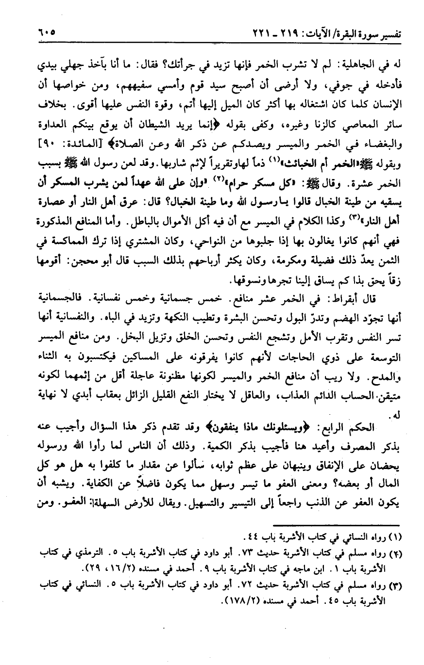قال أبقراط: في الخمر عشر منافع. خمس جسمانية وخمس نفسانية. فالجسمانية أنها تجوّد الهضم وتدرّ البول وتحسن البشرة وتطيب النكهة وتزيد في الباه. والنفسانية أنها تسر النفس وتقرب الأمل وتشجع النفس وتحسن الخلق وتزيل البخل. ومن منافع الميسر التوسعة على ذوي الحاجات لأنهم كانوا يفرقونه على المساكين فيكتسبون به الثناء والمدح. ولا ريب أن منافع الخمر والميسر لكونها مظنونة عاجلة أقل من إثمهما لكونه متيقن. الحساب الدائم العذاب، والعاقل لا يختار النفع القليل الزائل بعقاب أبدي لا نهاية له.