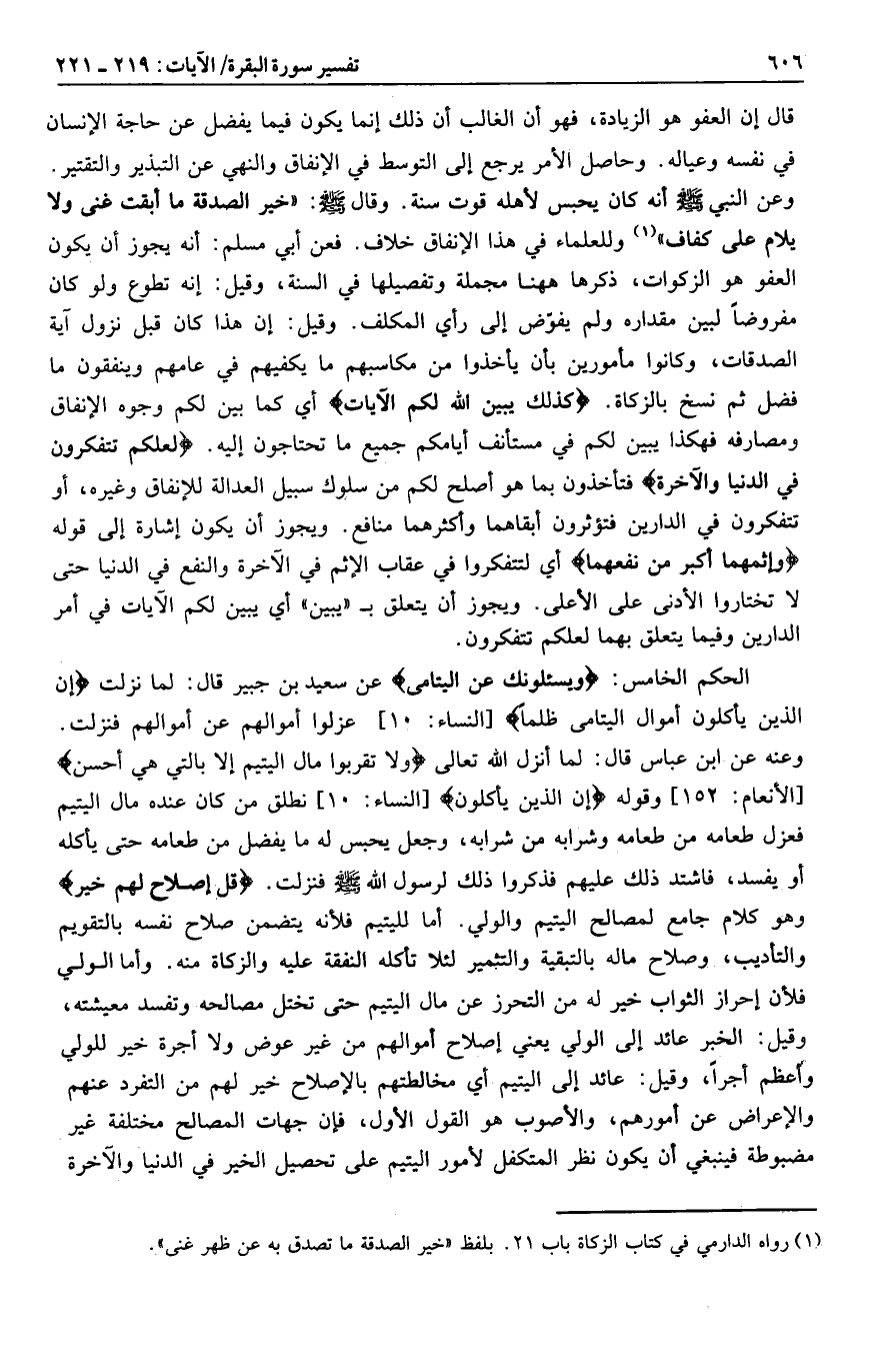وللعلماء في هذا الإنفاق خلاف. فعن أبي مسلم: أنه يجوز أن يكون العفو هو الزكوات، ذكرها هاهنا مجملة وتفصيلها في السنة، وقيل: إنه تطوع ولو كان مفروضا لبين مقداره ولم يفوّض إلى رأي المكلف. وقيل: إن هذا كان قبل نزول آية الصدقات، وكانوا مأمورين بأن يأخذوا من مكاسبهم ما يكفيهم في عامهم وينفقون ما فضل ثم نسخ بالزكاة. كَذلِكَ يُبَيِّنُ اللَّهُ لَكُمُ الْآياتِ أي كما بين لكم وجوه الإنفاق ومصارفه فهكذا يبين لكم في مستأنف أيامكم جميع ما تحتاجون إليه. لَعَلَّكُمْ تَتَفَكَّرُونَ فِي الدُّنْيا وَالْآخِرَةِ فتأخذون بما هو أصلح لكم من سلوك سبيل العدالة للإنفاق وغيره، أو تتفكرون في الدارين فتؤثرون أبقاهما وأكثرهما منافع. ويجوز أن يكون إشارة إلى قوله وَإِثْمُهُما أَكْبَرُ مِنْ نَفْعِهِما أي لتتفكروا في عقاب الإثم في الآخرة والنفع في الدنيا حتى لا تختاروا الأدنى على الأعلى. ويجوز أن يتعلق ب «يبين» أي يبين لكم الآيات في أمر الدارين وفيما يتعلق بهما لعلكم تتفكرون.