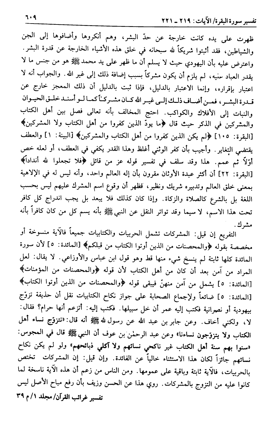 التفريع إن قيل: المشركات تشمل الحربيات والكتابيات جميعا فالآية منسوخة أو مخصصة بقوله وَالْمُحْصَناتُ مِنَ الَّذِينَ أُوتُوا الْكِتابَ مِنْ قَبْلِكُمْ [المائدة: 5] لأن سورة المائدة كلها ثابتة لم ينسخ شيء منها قط وهو قول ابن عباس والأوزاعي. لا يقال: لعل المراد من آمن بعد أن كان من أهل الكتاب لأن قوله وَالْمُحْصَناتُ مِنَ الْمُؤْمِناتِ [المائدة: 5] يشمل من آمن منهنّ فيبقى قوله وَالْمُحْصَناتُ مِنَ الَّذِينَ أُوتُوا الْكِتابَ [المائدة: 5] ضائعا ولإجماع الصحابة على جواز نكاح الكتابيات نقل أن حذيفة تزوّج بيهودية أو نصرانية فكتب إليه عمر أن خل سبيلها. فكتب إليه: أتزعم أنها حرام؟ فقال: