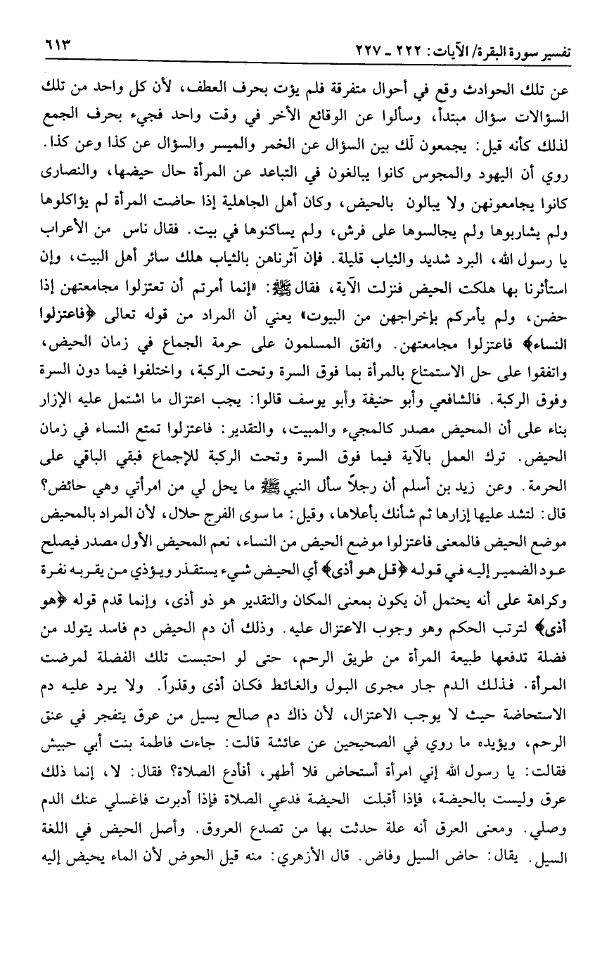 يعني أن المراد من قوله تعالى فَاعْتَزِلُوا النِّساءَ فاعتزلوا مجامعتهن. واتفق المسلمون على حرمة الجماع في زمان الحيض، واتفقوا على حل الاستمتاع بالمرأة بما فوق السرة وتحت الركبة، واختلفوا فيما دون السرة وفوق الركبة. فالشافعي وأبو حنيفة وأبو يوسف قالوا: يجب اعتزال ما اشتمل عليه الإزار بناء على أن المحيض مصدر كالمجيء والمبيت، والتقدير: فاعتزلوا تمتع النساء في زمان الحيض. ترك العمل بالآية فيما فوق السرة وتحت الركبة للإجماع فبقي الباقي على الحرمة.