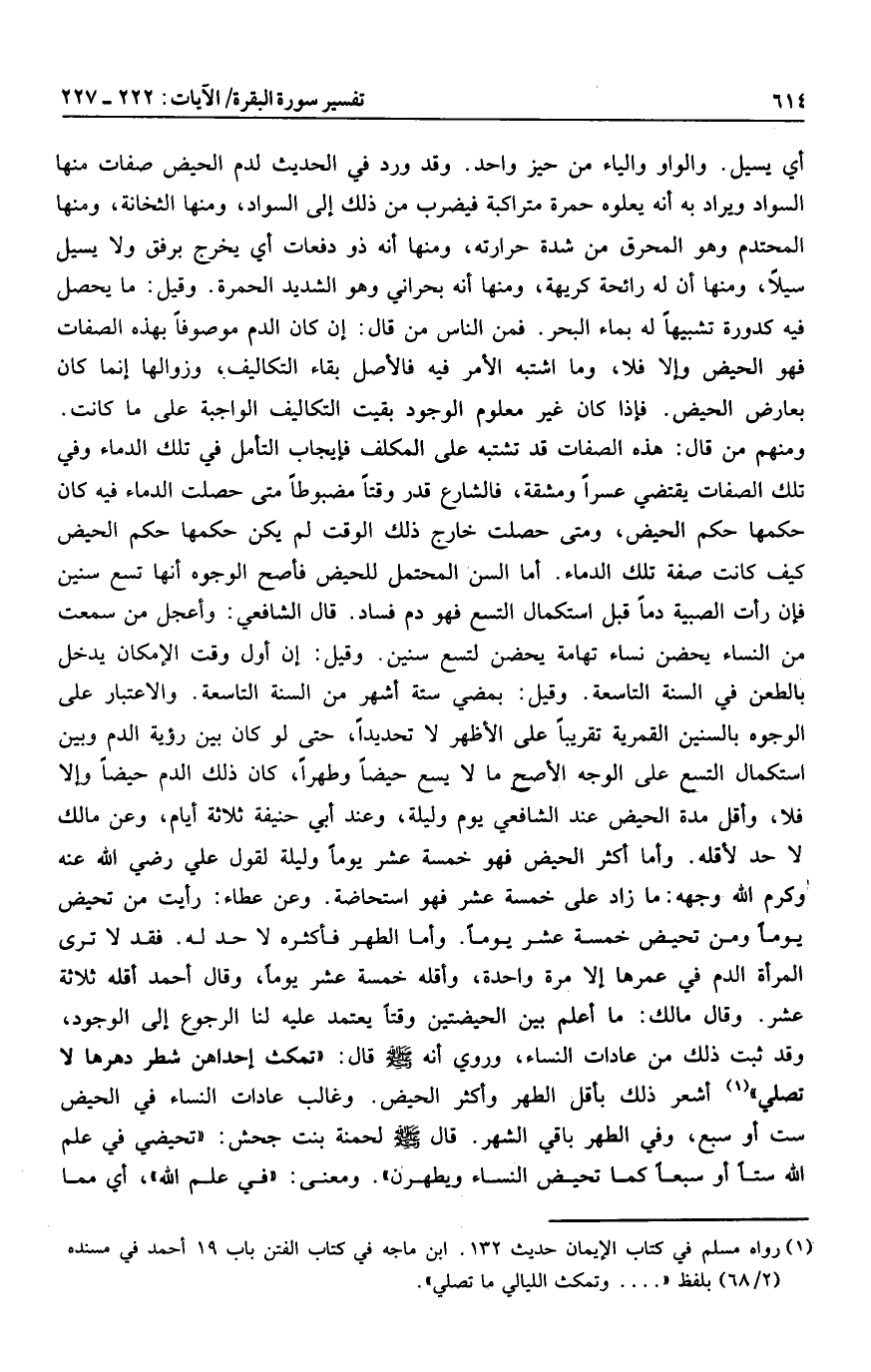 ومنهم من قال: هذه الصفات قد تشتبه على المكلف فإيجاب التأمل في تلك الدماء وفي تلك الصفات يقتضي عسرا ومشقة، فالشارع قدر وقتا مضبوطا متى حصلت الدماء فيه كان حكمها حكم الحيض، ومتى حصلت خارج ذلك الوقت لم يكن حكمها حكم الحيض كيف كانت صفة تلك الدماء. أما السن المحتمل للحيض فأصح الوجوه أنها تسع سنين فإن رأت الصبية دما قبل استكمال التسع فهو دم فساد. قال الشافعي: وأعجل من سمعت من النساء يحضن نساء تهامة يحضن لتسع سنين. وقيل: إن أول وقت الإمكان يدخل بالطعن في السنة التاسعة. وقيل: بمضي ستة أشهر من السنة التاسعة. والاعتبار على الوجوه بالسنين القمرية تقريبا على الأظهر لا تحديدا، حتى لو كان بين رؤية الدم وبين استكمال التسع على الوجه الأصح ما لا يسع حيضا وطهرا، كان ذلك الدم حيضا وإلا فلا، وأقل مدة الحيض عند الشافعي يوم وليلة، وعند أبي حنيفة ثلاثة أيام، وعن مالك لا حد لأقله. وأما أكثر الحيض فهو خمسة عشر يوما وليلة