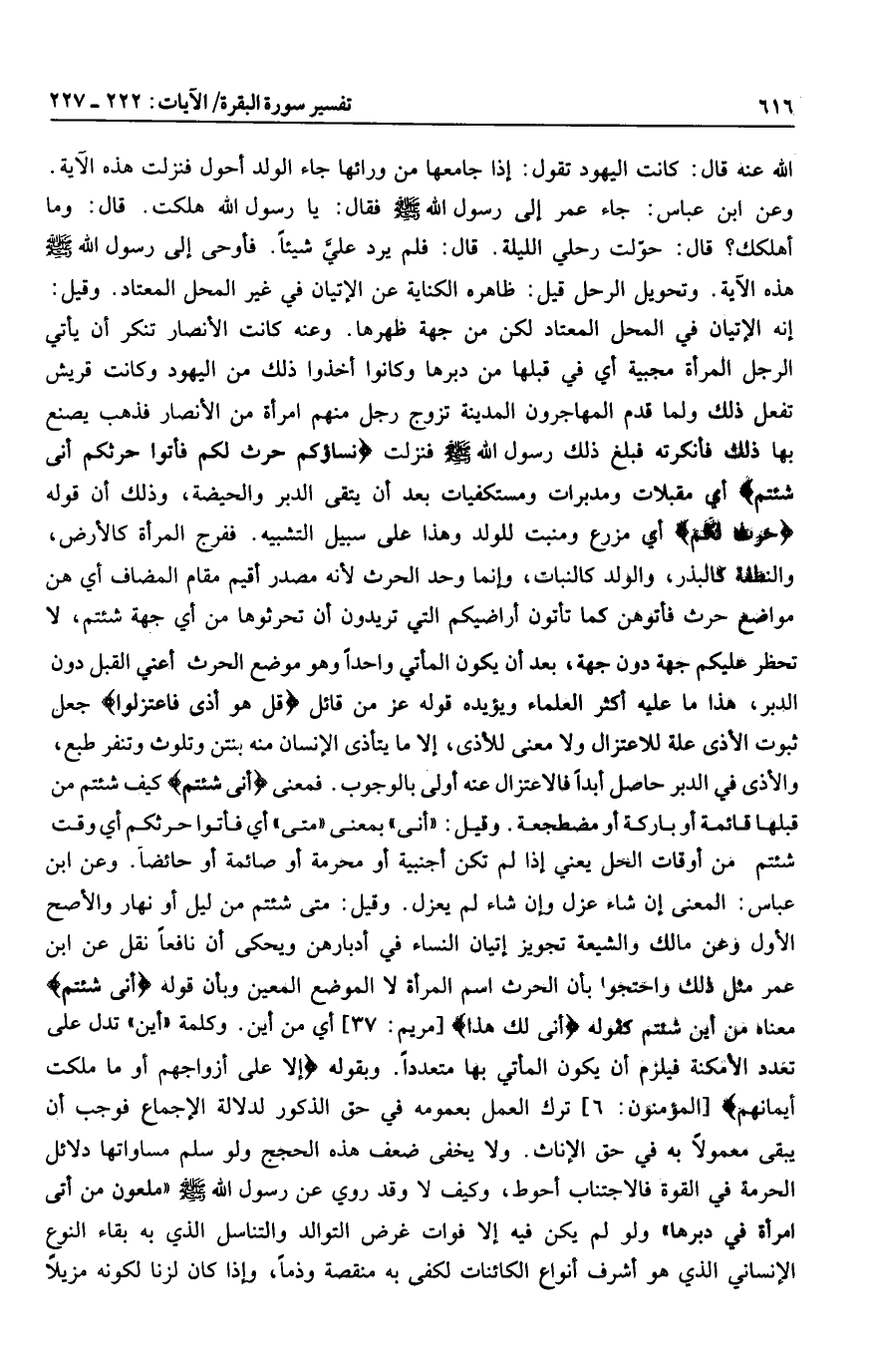 أي مقبلات ومدبرات ومستكفيات بعد أن يتقى الدبر والحيضة، وذلك أن قوله حَرْثٌ لَكُمْ أي مزرع ومنبت للولد وهذا على سبيل التشبيه. ففرج المرأة كالأرض، والنطفة كالبذر، والولد كالنبات، وإنما وحد الحرث لأنه مصدر أقيم مقام المضاف أي هن مواضع حرث فأتوهن كما تأتون أراضيكم التي تريدون أن تحرثوها من أي جهة شئتم، لا تحظر عليكم جهة دون جهة، بعد أن يكون المأتي واحدا وهو موضع الحرث أعني القبل دون الدبر، هذا ما عليه أكثر العلماء ويؤيده قوله عز من قائل قُلْ هُوَ أَذىً فَاعْتَزِلُوا جعل ثبوت الأذى علة للاعتزال ولا معنى للأذى، إلا ما يتأذى الإنسان منه بنتن وتلوث وتنفر طبع، والأذى في الدبر حاصل أبدا فالاعتزال عنه أولى بالوجوب. فمعنى أَنَّى شِئْتُمْ كيف شئتم من قبلها قائمة أو باركة أو مضطجعة. وقيل: «أنى» بمعنى «متى» أي فأتوا حرثكم أي وقت شئتم من أوقات الحل يعني إذا لم تكن أجنبية أو محرمة أو صائمة أو حائضا. وعن ابن عباس: المعنى إن شاء عزل وإن شاء لم يعزل. وقيل: متى شئتم من ليل أو نهار والأصح الأول وعن مالك والشيعة تجويز إتيان النساء في أدبارهن ويحكى أن نافعا نقل عن ابن عمر مثل ذلك واحتجوا بأن الحرث اسم المرأة لا الموضع المعين وبأن قوله أَنَّى شِئْتُمْ معناه من أين شئتم كقوله أَنَّى لَكِ هذا [مريم: 37] أي من أين. وكلمة «أين» تدل على تعدد الأمكنة فيلزم أن يكون المأتي بها متعددا. وبقوله إِلَّا عَلى أَزْواجِهِمْ أَوْ ما مَلَكَتْ أَيْمانُهُمْ [المؤمنون: 6] ترك العمل بعمومه في حق الذكور لدلالة الإجماع فوجب أن يبقى معمولا به في حق الإناث. ولا يخفى ضعف هذه الحجج ولو سلم مساواتها دلائل الحرمة في القوة فالاجتناب أحوط، وكيف لا