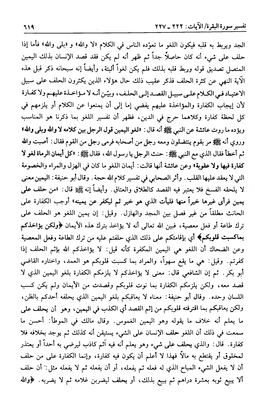 الجد ويربط به قلبه فيكون اللغو ما تعوّده الناس في الكلام «لا والله» و «بلى والله» فأما إذا حلف على شيء أنه كان حاصلا جدا ثم ظهر أنه لم يكن فقد قصد الإنسان بذلك اليمين المتصل تصديق قوله وربط قلبه بذلك فلم يكن لغوا البتة، وأيضا إنه سبحانه ذكر قبل هذه الآية النهي عن كثرة الحلف فذكر عقيب ذلك حال هؤلاء الذين يكثرون الحلف على سبيل الاعتياد في الكلام على سبيل القصد إلى الحلف، وبيّن أنه لا مؤاخذة عليهم ولا كفارة لأن إيجاب الكفارة والمؤاخذة عليهم يفضي إما إلى أن يمنعوا عن الكلام أو يلزمهم في كل لحظة كفارة وكلاهما حرج في الدين، فظهر أن تفسير اللغو بما ذكرنا هو المناسب ويؤده ما