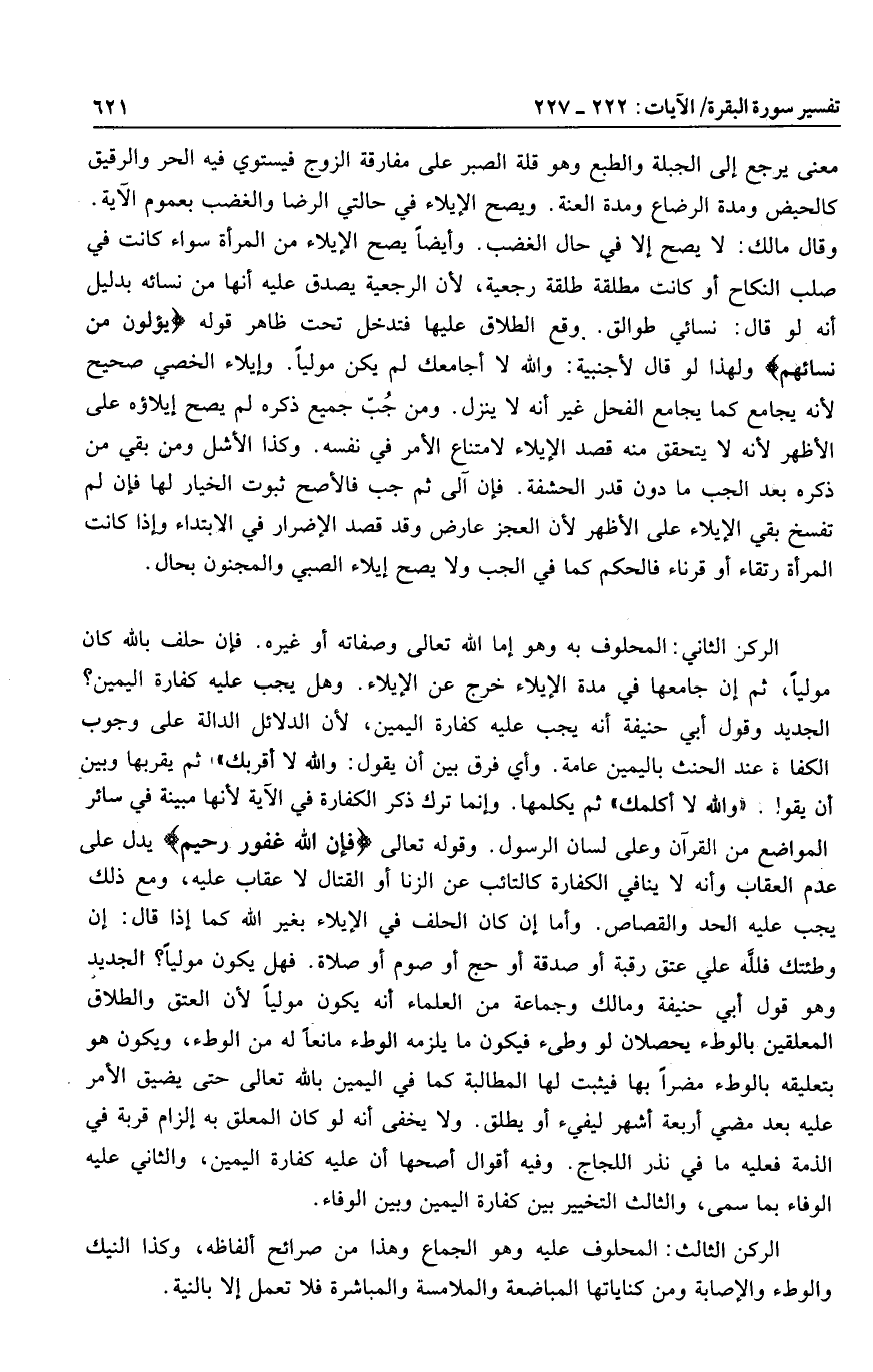 الجديد وقول أبي حنيفة أنه يجب عليه كفارة اليمين، لأن الدلائل الدالة على وجوب الكفارة عند الحنث باليمين عامة. وأي فرق بين أن يقول: والله لا أقربك» ثم يقربها وبين أن يقوا. «والله لا أكلمك» ثم يكلمها. وإنما ترك ذكر الكفارة في الآية لأنها مبينة في سائر المواضع من القرآن وعلى لسان الرسول. وقوله تعالى فَإِنَّ اللَّهَ غَفُورٌ رَحِيمٌ يدل على عدم العقاب وأنه لا ينافي الكفارة كالتائب عن الزنا أو القتال لا عقاب عليه، ومع ذلك يجب عليه الحد والقصاص. وأما إن كان الحلف في الإيلاء بغير الله كما إذا قال: إن وطئتك فلله علي عتق رقبة أو صدقة أو حج أو صوم أو صلاة. فهل يكون موليا؟ الجديد وهو قول أبي حنيفة ومالك وجماعة من العلماء أنه يكون موليا لأن العتق والطلاق المعلقين بالوطء يحصلان لو وطئ فيكون ما يلزمه الوطء مانعا له من الوطء، ويكون هو بتعليقه بالوطء مضرا بها فيثبت لها المطالبة كما في اليمين بالله تعالى حتى يضيق الأمر عليه بعد مضي أربعة أشهر ليفيء أو يطلق. ولا يخفى أنه لو كان المعلق به إلزام قربة في الذمة فعليه ما في نذر اللجاج. وفيه أقوال أصحها أن عليه كفارة اليمين، والثاني عليه الوفاء بما سمى، والثالث التخيير بين كفارة اليمين وبين الوفاء.