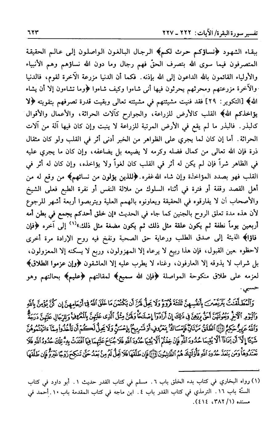 ببقاء الشهود نِساؤُكُمْ حَرْثٌ لَكُمْ الرجال البالغون الواصلون إلى عالم الحقيقة المتصرفون فيما سوى الله بتصرف الحقّ فهم رجال وما دون الله نساؤهم وهم الأنبياء والأولياء القائمون بالله الداعون إلى الله بإذنه. فكما أن الدنيا مزرعة الآخرة لقوم، فالدنيا والآخرة مزرعتهم ومحرثهم يحرثون فيها أنى شاءوا وكيف شاءوا وَما تَشاؤُنَ إِلَّا أَنْ يَشاءَ اللَّهُ [التكوير: 29] فقد فنيت مشيئتهم في مشيئته تعالى وبقيت قدرة تصرفهم بتقويته لا يُؤاخِذُكُمُ اللَّهُ القلب كالأرض للزراعة، والجوارح كآلات الحراثة، والأعمال والأقوال كالبذر. فالبذر ما لم يقع في الأرض المرتبة للزراعة لا ينبت وإن كان فيها آلة من آلات الحراثة. أما إن كان لما يجري على الظواهر من الخبر أدنى أثر في القلب ولو كان مثقال ذرة فإن الله تعالى من كمال فضله وكرمه لا يضيعه بل يضاعفه، وإن كان ما يجري عليه في الظاهر شرا فإن لم يكن له أثر في القلب كان لغوا ولا يؤاخذه، وإن كان له أثر في القلب فهو بصدد المؤاخذة وإن شاء الله غفره. لِلَّذِينَ يُؤْلُونَ مِنْ نِسائِهِمْ من وقع له من أهل القصد وقفة أو فترة في أثناء السلوك من ملالة النفس أو نفرة الطبع فعلى الشيخ والأصحاب أن لا يفارقوه في الحقيقة ويعاونوه بالهمم العلية ويتربصوا أربعة أشهر للرجوع لأن هذه مدة تعلق الروح بالجنين كما