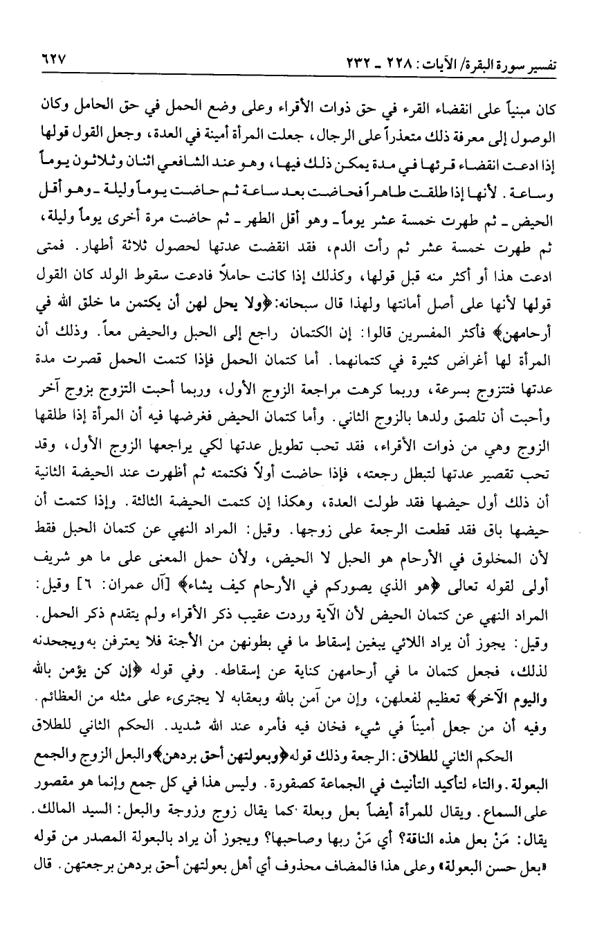 وفيه أن من جعل أمينا في شيء فخان فيه فأمره عند الله شديد. الحكم الثاني للطلاق الحكم الثاني للطلاق: الرجعة وذلك قوله وَبُعُولَتُهُنَّ أَحَقُّ بِرَدِّهِنَّ والبعل الزوج والجمع البعولة. والتاء لتأكيد التأنيث في الجماعة كصقورة. وليس هذا في كل جمع وإنما هو مقصور على السماع. ويقال للمرأة أيضا بعل وبعلة كما يقال زوج وزوجة والبعل: السيد المالك.