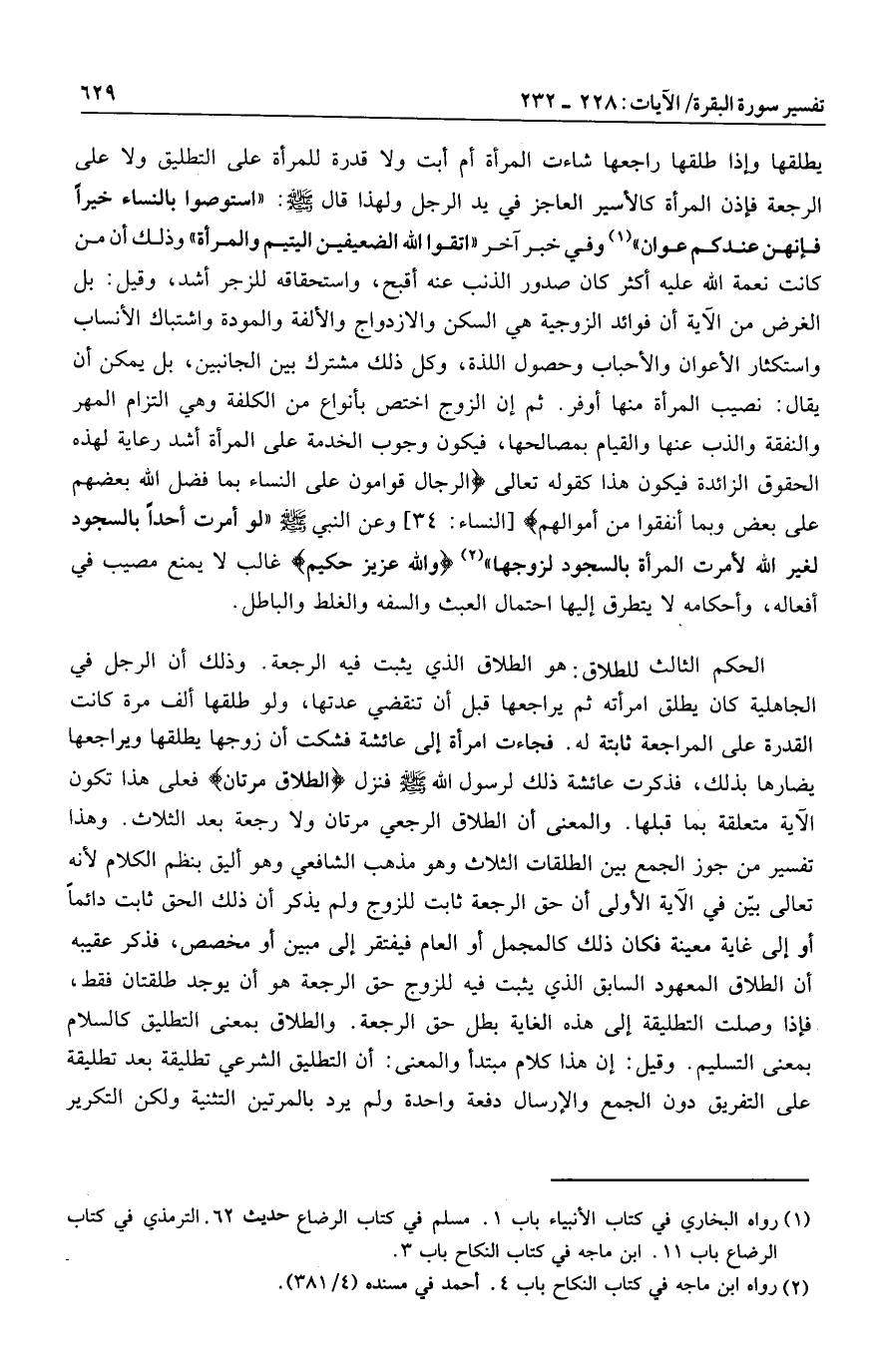 الحكم الثالث للطلاق: هو الطلاق الذي يثبت فيه الرجعة. وذلك أن الرجل في الجاهلية كان يطلق امرأته ثم يراجعها قبل أن تنقضي عدتها، ولو طلقها ألف مرة كانت القدرة على المراجعة ثابتة له. فجاءت امرأة إلى عائشة فشكت أن زوجها يطلقها ويراجعها يضارها بذلك، فذكرت عائشة ذلك لرسول الله صلى الله عليه وسلم فنزل الطَّلاقُ مَرَّتانِ فعلى هذا تكون الآية متعلقة بما قبلها. والمعنى أن الطلاق الرجعي مرتان ولا رجعة بعد الثلاث. وهذا تفسير من جوز الجمع بين الطلقات الثلاث وهو مذهب الشافعي وهو أليق بنظم الكلام لأنه تعالى بيّن في الآية الأولى أن حق الرجعة ثابت للزوج ولم يذكر أن ذلك الحق ثابت دائما أو إلى غاية معينة فكان ذلك كالمجمل أو العام فيفتقر إلى مبين أو مخصص، فذكر عقيبه أن الطلاق المعهود السابق الذي يثبت فيه للزوج حق الرجعة هو أن يوجد طلقتان فقط، فإذا وصلت التطليقة إلى هذه الغاية بطل حق الرجعة. والطلاق بمعنى التطليق كالسلام بمعنى التسليم. وقيل: إن هذا كلام مبتدأ والمعنى: أن التطليق الشرعي تطليقة بعد تطليقة على التفريق دون الجمع والإرسال دفعة واحدة ولم يرد بالمرتين التثنية ولكن التكرير