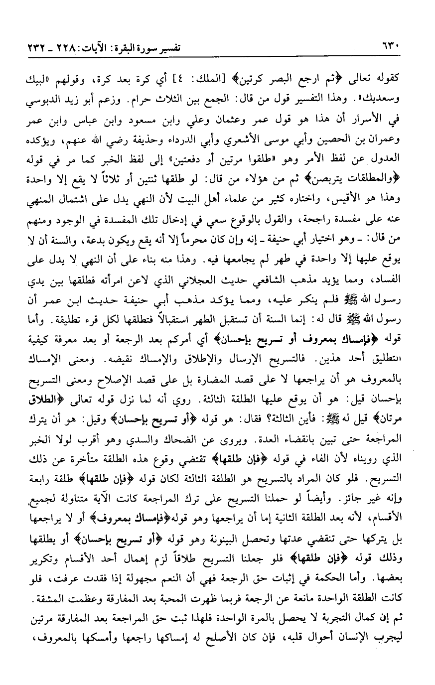 وقيل: هو أن يترك المراجعة حتى تبين بانقضاء العدة. ويروى عن الضحاك والسدي وهو أقرب لولا الخبر الذي رويناه لأن الفاء في قوله فَإِنْ طَلَّقَها تقتضي وقوع هذه الطلقة متأخرة عن ذلك التسريح. فلو كان المراد بالتسريح هو الطلقة الثالثة لكان قوله فَإِنْ طَلَّقَها طلقة رابعة وإنه غير جائز. وأيضا لو حملنا التسريح على ترك المراجعة كانت الآية متناولة لجميع الأقسام، لأنه بعد الطلقة الثانية إما أن يراجعها وهو قوله فَإِمْساكٌ بِمَعْرُوفٍ أو لا يراجعها بل يتركها حتى تنقضي عدتها وتحصل البينونة وهو قوله أَوْ تَسْرِيحٌ بِإِحْسانٍ أو يطلقها وذلك قوله فَإِنْ طَلَّقَها فلو جعلنا التسريح طلاقا لزم إهمال أحد الأقسام وتكرير بعضها. وأما الحكمة في إثبات حق الرجعة فهي أن النعم مجهولة إذا فقدت عرفت، فلو كانت الطلقة الواحدة مانعة عن الرجعة فربما ظهرت المحبة بعد المفارقة وعظمت المشقة.