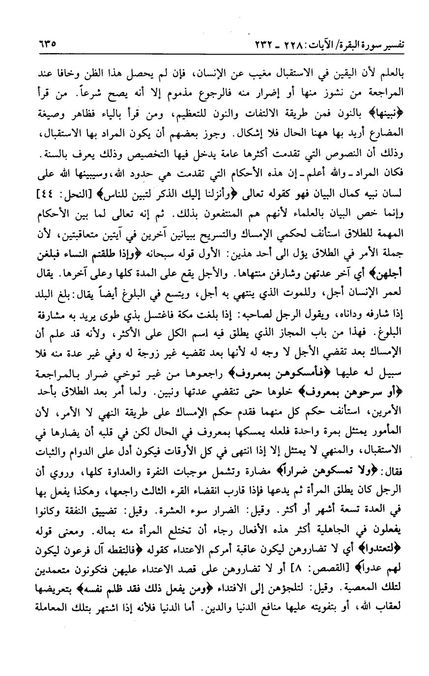 فكان المراد- والله أعلم- إن هذه الأحكام التي تقدمت هي حدود الله، وسيبينها الله على لسان نبيه كمال البيان فهو كقوله تعالى وَأَنْزَلْنا إِلَيْكَ الذِّكْرَ لِتُبَيِّنَ لِلنَّاسِ [النحل: 44] وإنما خص البيان بالعلماء لأنهم هم المنتفعون بذلك. ثم إنه تعالى لما بين الأحكام المهمة للطلاق استأنف لحكمي الإمساك والتسريح ببيانين آخرين في آيتين متعاقبتين، لأن جملة الأمر في الطلاق يؤل الى أحد هذين: الأول قوله سبحانه وَإِذا طَلَّقْتُمُ النِّساءَ فَبَلَغْنَ أَجَلَهُنَّ أي آخر عدتهن وشارفن منتهاها. والأجل يقع على المدة كلها وعلى آخرها. يقال لعمر الإنسان أجل، وللموت الذي ينتهي به أجل، ويتسع في البلوغ أيضا يقال: بلغ البلد إذا شارفه وداناه، ويقول الرجل لصاحبه: إذا بلغت مكة فاغتسل بذي طوى يريد به مشارفة البلوغ. فهذا من باب المجاز الذي يطلق فيه اسم الكل على الأكثر، ولأنه قد علم أن الإمساك بعد تقضي الأجل لا وجه له لأنها بعد تقضيه غير زوجة له وفي غير عدة منه فلا سبيل له عليها فَأَمْسِكُوهُنَّ بِمَعْرُوفٍ راجعوها من غير توخي ضرار بالمراجعة أَوْ سَرِّحُوهُنَّ بِمَعْرُوفٍ خلوها حتى تنقضي عدتها ونبين. ولما أمر بعد الطلاق بأحد الأمرين، استأنف حكم كل منهما فقدم حكم الإمساك على طريقة النهي لا الأمر، لأن المأمور يمتثل بمرة واحدة فلعله يمسكها بمعروف في الحال لكن في قلبه أن يضارها في الاستقبال، والمنهي لا يمتثل إلا إذا انتهى في كل الأوقات فيكون أدل على الدوام والثبات فقال: وَلا تُمْسِكُوهُنَّ ضِراراً مضارة وتشمل موجبات النفرة والعداوة كلها، وروي أن الرجل كان يطلق المرأة ثم يدعها فإذا قارب انقضاء القرء الثالث راجعها، وهكذا يفعل بها في العدة تسعة أشهر أو أكثر. وقيل: الضرار سوء العشرة. وقيل: تضييق النفقة وكانوا يفعلون في الجاهلية أكثر هذه الأفعال رجاء أن تختلع المرأة منه بماله. ومعنى قوله لِتَعْتَدُوا أي لا تضاروهن ليكون عاقبة أمركم الاعتداء كقوله فَالْتَقَطَهُ آلُ فِرْعَوْنَ لِيَكُونَ لَهُمْ عَدُوًّا [القصص: 8] أو لا تضاروهن على قصد الاعتداء عليهن فتكونون متعمدين لتلك المعصية. وقيل: لتلجؤهن إلى الافتداء وَمَنْ يَفْعَلْ ذلِكَ فَقَدْ ظَلَمَ نَفْسَهُ بتعريضها لعقاب الله، أو بتفويته عليها منافع الدنيا والدين. أما الدنيا فلأنه إذا اشتهر بتلك المعاملة