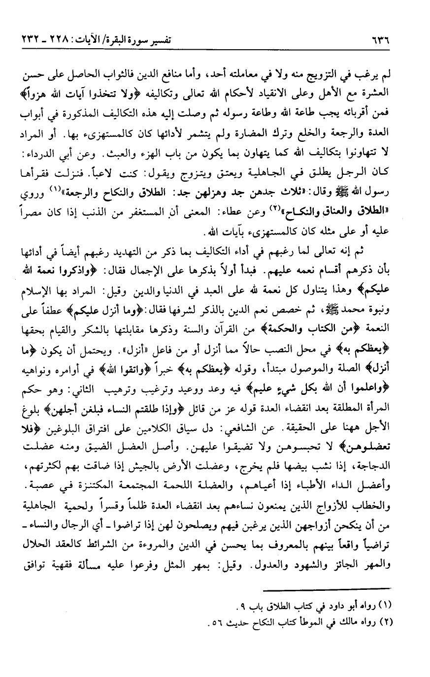 لم يرغب في التزويج منه ولا في معاملته أحد، وأما منافع الدين فالثواب الحاصل على حسن العشرة مع الأهل وعلى الانقياد لأحكام الله تعالى وتكاليفه وَلا تَتَّخِذُوا آياتِ اللَّهِ هُزُواً فمن أقربائه يجب طاعة الله وطاعة رسوله ثم وصلت إليه هذه التكاليف المذكورة في أبواب العدة والرجعة والخلع وترك المضارة ولم يتشمر لأدائها كان كالمستهزىء بها. أو المراد لا تتهاونوا بتكاليف الله كما يتهاون بما يكون من باب الهزء والعبث.