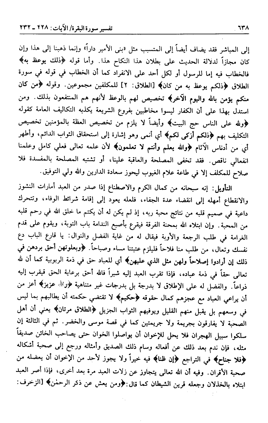 إنه سبحانه من كمال الكرم والاصطناع إذا صدر من العبد أمارات النشوز والانقطاع أمهله إلى انقضاء عدة الجفاء، فلعله يعود إلى إقامة شرائط الوفاء، وتتحرك داعية في صميم قلبه من نتائج محبة ربه، إذ لم يكن له أن يكتم ما خلق الله في رحم قلبه من المحبة. وإن ابتلاه الله بمحنة الفرقة فيقرع بأصبع الندامة باب التوبة، ويقوم على قدم الغرامة في طلب الرجعة والأوبة فيقال له من غاية الفضل والنوال: يا قارع الباب دع نفسك وتعال، من طلب منا فلاحا فليلزم عتبتنا مساء وصباحا. وَبُعُولَتُهُنَّ أَحَقُّ بِرَدِّهِنَّ فِي ذلِكَ إِنْ أَرادُوا إِصْلاحاً وَلَهُنَّ مِثْلُ الَّذِي عَلَيْهِنَّ أي للعباد حق في ذمة الربوبية كما أن لله تعالى حقا في ذمة عباده، فإذا تقرب العبد إليه شبرا فالله أحق برعاية الحق قيقرب إليه ذراعا. والفضل له على الإطلاق لا بدرجة بل بدرجات غير متناهية وَاللَّهُ عَزِيزٌ أعز من أن يراعي العباد مع عجزهم كمال حقوقه حَكِيمٌ لا تقتضي حكمته أن يطالبهم بما ليس في وسعهم بل يقبل منهم القليل ويوفيهم الثواب الجزيل الطَّلاقُ مَرَّتانِ يعني أن أهل الصحبة لا يفارقون بجريمة ولا جريمتين كما في قصة موسى والخضر. ثم في الثالثة إن سلكوا سبيل الهجران فلا يحل للإخوان أن يواصلوا الخوان حتى يصاحب الخائن صديقا مثله، فإن ندم بعد ذلك عن أفعاله وسام ذلك الصديق وأمثاله ورجع إلى صحبة أشكاله فَلا جُناحَ في التراجع إِنْ ظَنَّا فيه خيرا ولا يجوز لأحد من الإخوان أن يعضله من صحبة الأقران. وفيه أن الله تعالى يتجاوز عن زلات العبد مرة بعد أخرى، فإذا أصر العبد ابتلاه بالخذلان وجعله قرين الشيطان كما قال: وَمَنْ يَعْشُ عَنْ ذِكْرِ الرَّحْمنِ [الزخرف: