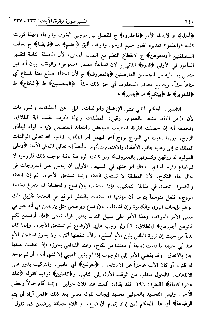 الحكم الثاني عشر: الإرضاع والوالدات. قيل: هن المطلقات والمزوجات لأن ظاهر اللفظ مشعر بالعموم. وقيل: المطلقات ولهذا ذكرت عقيب آية الطلاق.