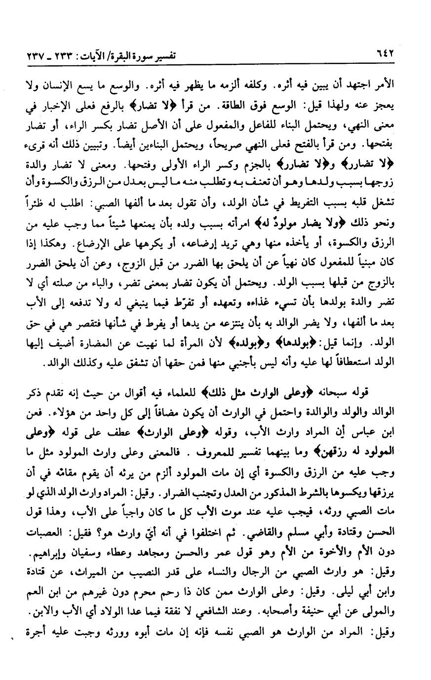 قوله سبحانه وَعَلَى الْوارِثِ مِثْلُ ذلِكَ للعلماء فيه أقوال من حيث إنه تقدم ذكر الوالد والولد والوالدة واحتمل في الوارث أن يكون مضافا إلى كل واحد من هؤلاء. فعن ابن عباس أن المراد وارث الأب، وقوله وَعَلَى الْوارِثِ عطف على قوله وَعَلَى الْمَوْلُودِ لَهُ رِزْقُهُنَّ وما بينهما تفسير للمعروف. فالمعنى وعلى وارث المولود مثل ما وجب عليه من الرزق والكسوة أي إن مات المولود ألزم من يرثه أن يقوم مقامه في أن يرزقها ويكسوها بالشرط المذكور من العدل وتجنب الضرار. وقيل: المراد وارث الولد الذي لو مات الصبي ورثه، فيجب عليه عند موت الأب كل ما كان واجبا على الأب، وهذا قول الحسن وقتادة وأبي مسلم والقاضي. ثم اختلفوا في أنه أيّ وارث هو؟ فقيل: العصبات دون الأم والأخوة من الأم وهو قول عمر والحسن ومجاهد وعطاء وسفيان وإبراهيم.