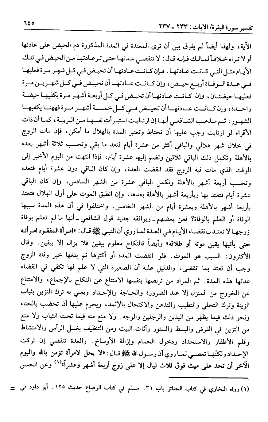 وأيضا فالنكاح معلوم بيقين فلا يزال إلا بيقين. وقال الأكثرون: السبب هو الموت. فلو انقضت المدة أو أكثرها ثم بلغها خبر وفاة الزوج وجب أن تعتد بما انقضى، والدليل عليه أن الصغيرة التي لا علم لها تكفي في انقضاء عدتها هذه المدة. ثم المراد من تربصها بنفسها الامتناع عن النكاح بالإجماع، والامتناع عن الخروج من المنزل إلا عند الضرورة والحاجة والإحداد ويعني به ترك التزين بثياب الزينة وترك التحلي والتطيب والتدهن والاكتحال بالإثمد، ويحرم عليها أن تخضب بالحناء ونحو ذلك فيما يظهر من اليدين والرجلين والوجه. ولا منع منه فيما تحت الثياب ولا منع من التزين في الفرش والبسط والستور وأثاث البيت ومن التنظيف بغسل الرأس والامتشاط وقلم الأظفار والاستحداد ودخول الحمام وإزالة الأوساخ. والعدة تنقضي إن تركت الإحداد ولكنّها تعصي لما