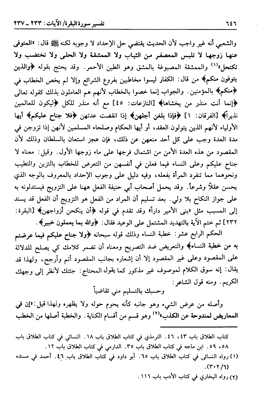 الحكم الرابع عشر: خطبة النساء وذلك قوله سبحانه وَلا جُناحَ عَلَيْكُمْ فِيما عَرَّضْتُمْ بِهِ مِنْ خِطْبَةِ النِّساءِ والتعريض ضد التصريح ومعناه أن تضمر كلامك كي يصلح للدلالة على المقصود وعلى غير المقصود إلا أن إشعاره بجانب المقصود أتم وأرجح، ولهذا قد يقال: إنه سوق الكلام لموصوف غير مذكور كما يقول المحتاج: جئتك لأنظر إلى وجهك الكريم. ومنه قول الشاعر: