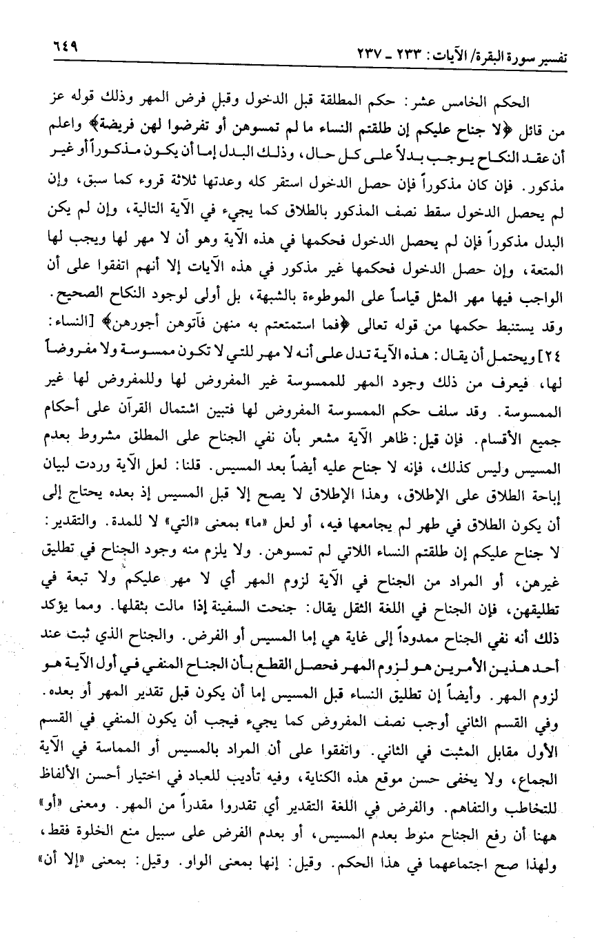 وفي القسم الثاني أوجب نصف المفروض كما يجيء فيجب أن يكون المنفي في القسم الأول مقابل المثبت في الثاني. واتفقوا على أن المراد بالمسيس أو المماسة في الآية الجماع، ولا يخفى حسن موقع هذه الكناية، وفيه تأديب للعباد في اختيار أحسن الألفاظ للتخاطب والتفاهم. والفرض في اللغة التقدير أي تقدروا مقدرا من المهر. ومعنى «أو» هاهنا أن رفع الجناح منوط بعدم المسيس، أو بعدم الفرض على سبيل منع الخلوة فقط، ولهذا صح اجتماعهما في هذا الحكم. وقيل: إنها بمعنى الواو. وقيل: بمعنى «إلا أن»