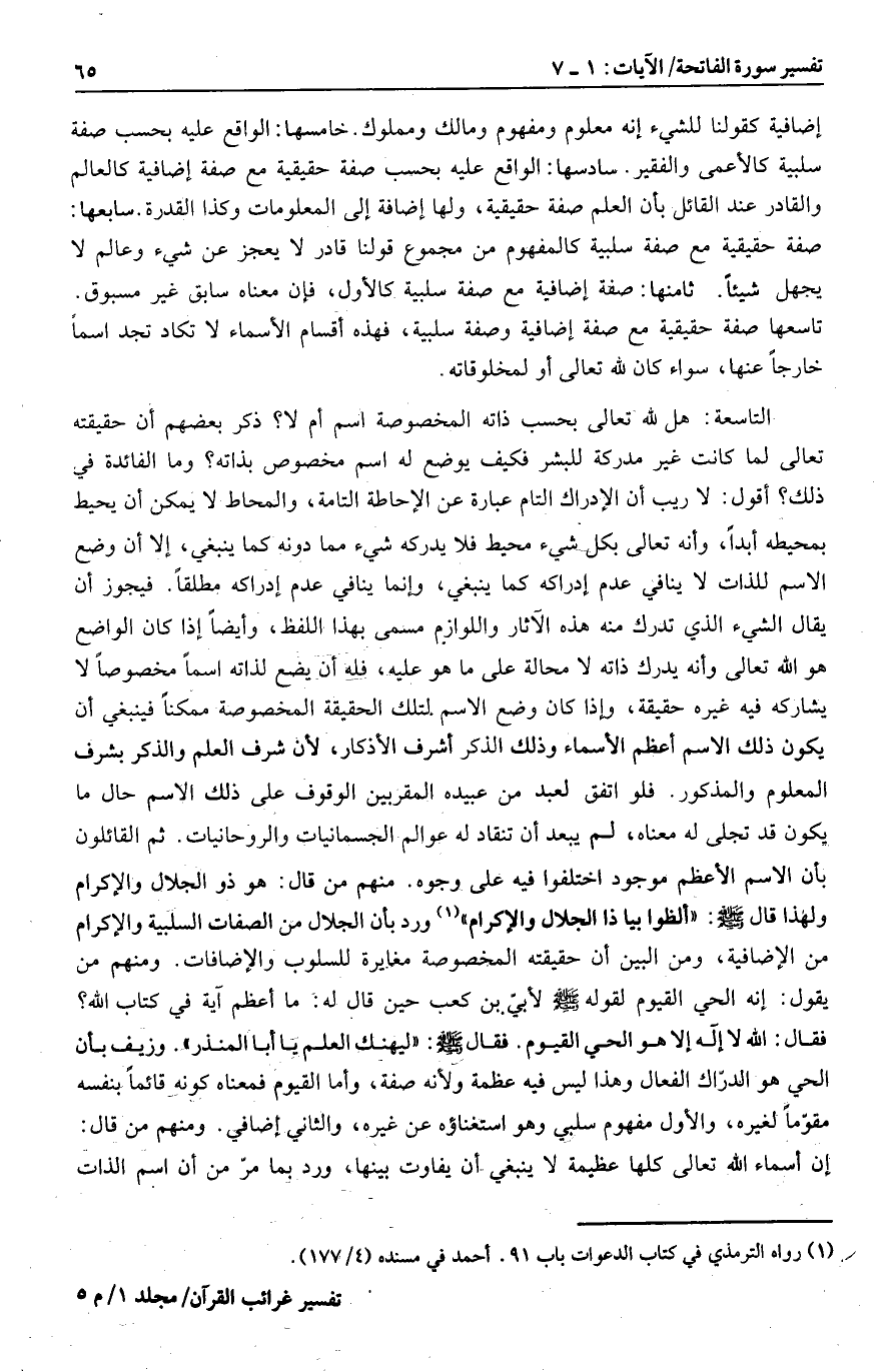صفة حقيقية مع صفة سلبية كالمفهوم من مجموع قولنا قادر لا يعجز عن شيء وعالم لا يجهل شيئا. ثامنها: صفة إضافية مع صفة سلبية كالأول، فإن معناه سابق غير مسبوق.