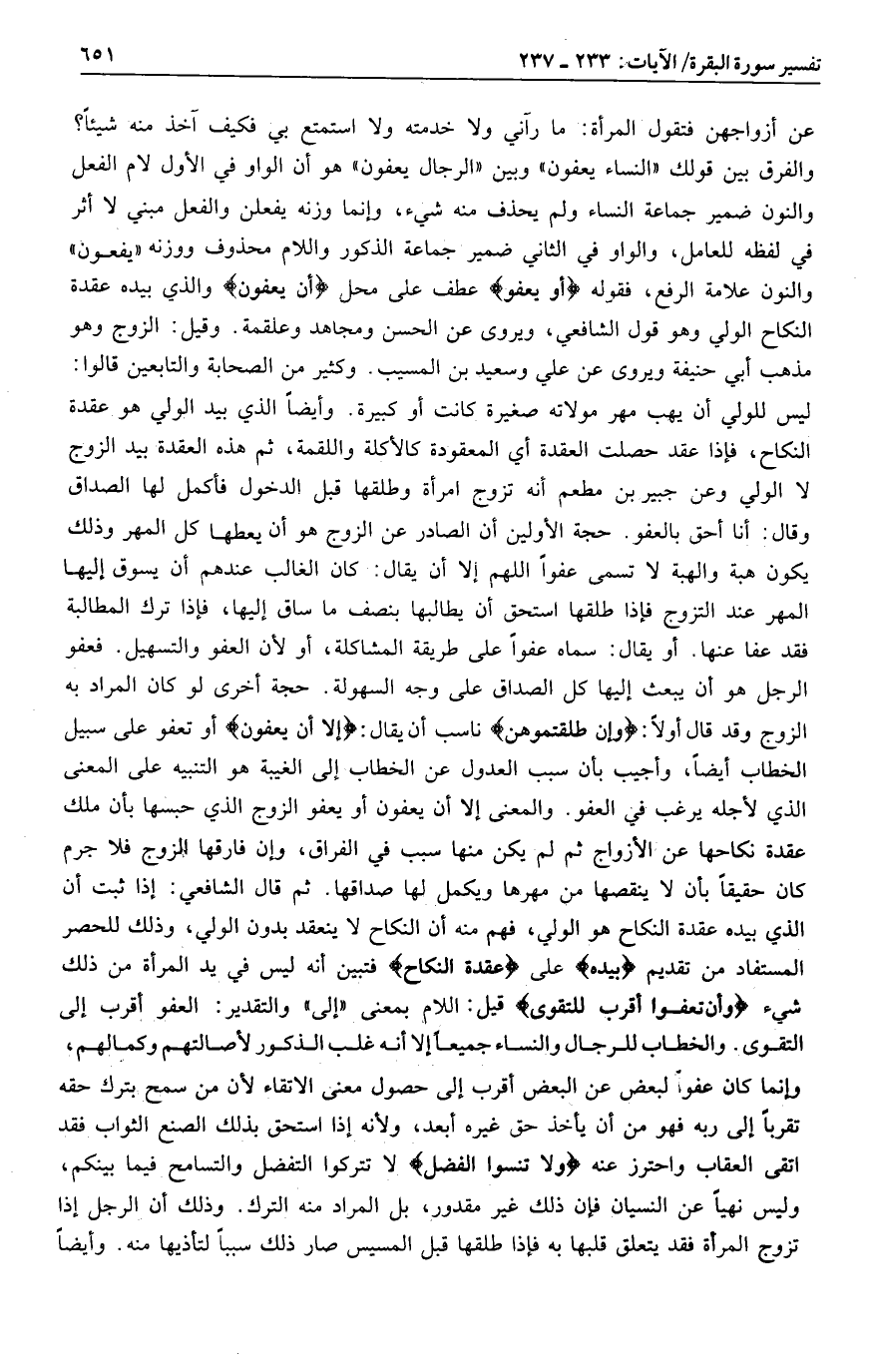 والفرق بين قولك «النساء يعفون» وبين «الرجال يعفون» هو أن الواو في الأول لام الفعل والنون ضمير جماعة النساء ولم يحذف منه شيء، وإنما وزنه يفعلن والفعل مبني لا أثر في لفظه للعامل، والواو في الثاني ضمير جماعة الذكور واللام محذوف ووزنه «يفعون» والنون علامة الرفع، فقوله أَوْ يَعْفُوَا عطف على محل أَنْ يَعْفُونَ والذي بيده عقدة النكاح الولي وهو قول الشافعي، ويروى عن الحسن ومجاهد وعلقمة.